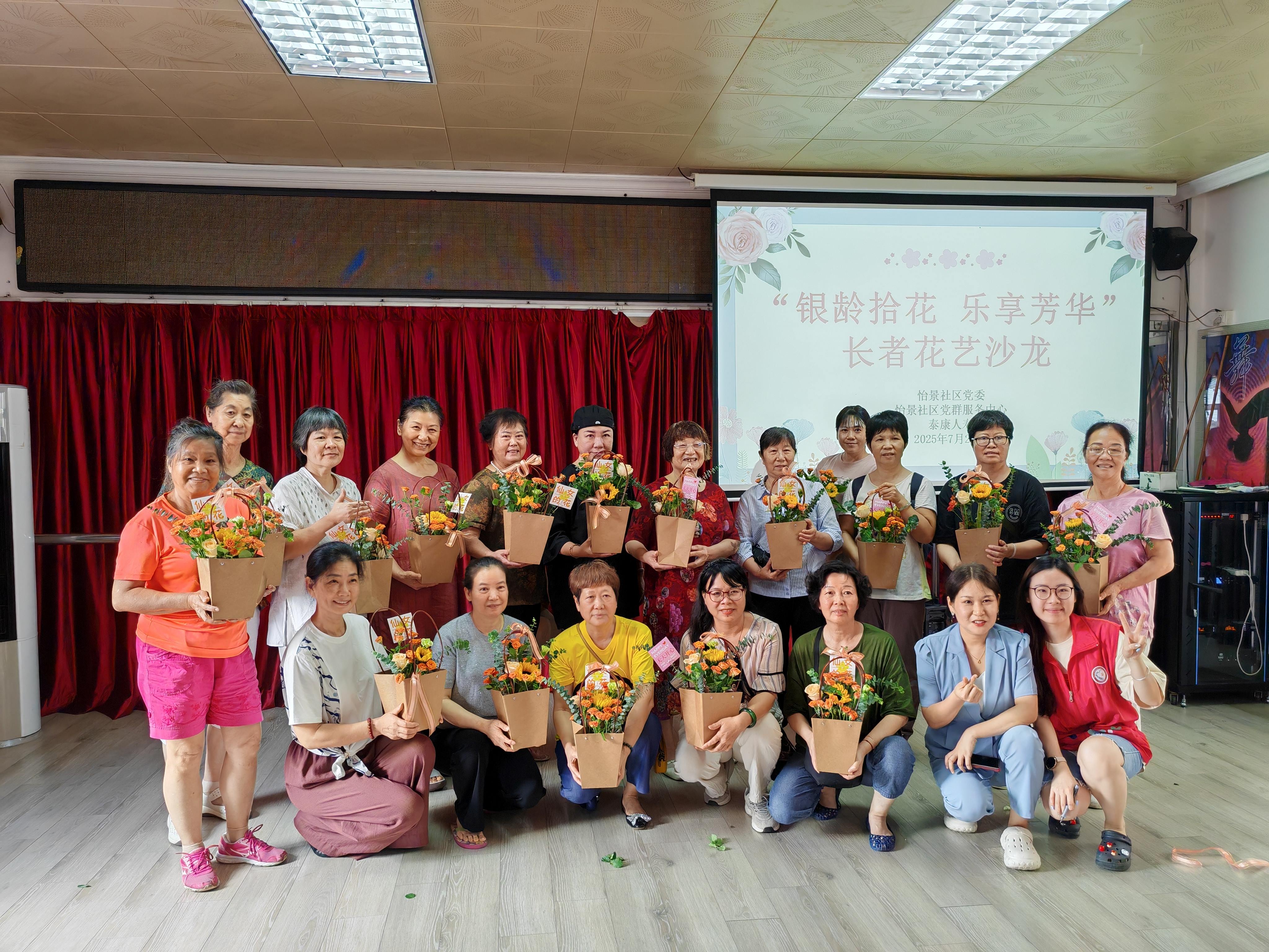 为响应“百千万工程”号召,提升社区老年群体幸福指数,让社区长者在花香中感受生活之美。7月23日下午,在怡景社区党委的指导下,新现代驻怡景社区党群服务中心联合泰康人寿保险公司开展“银龄拾花,乐享芳华”长者花艺沙龙,活动共吸引20位长者朋友参与。