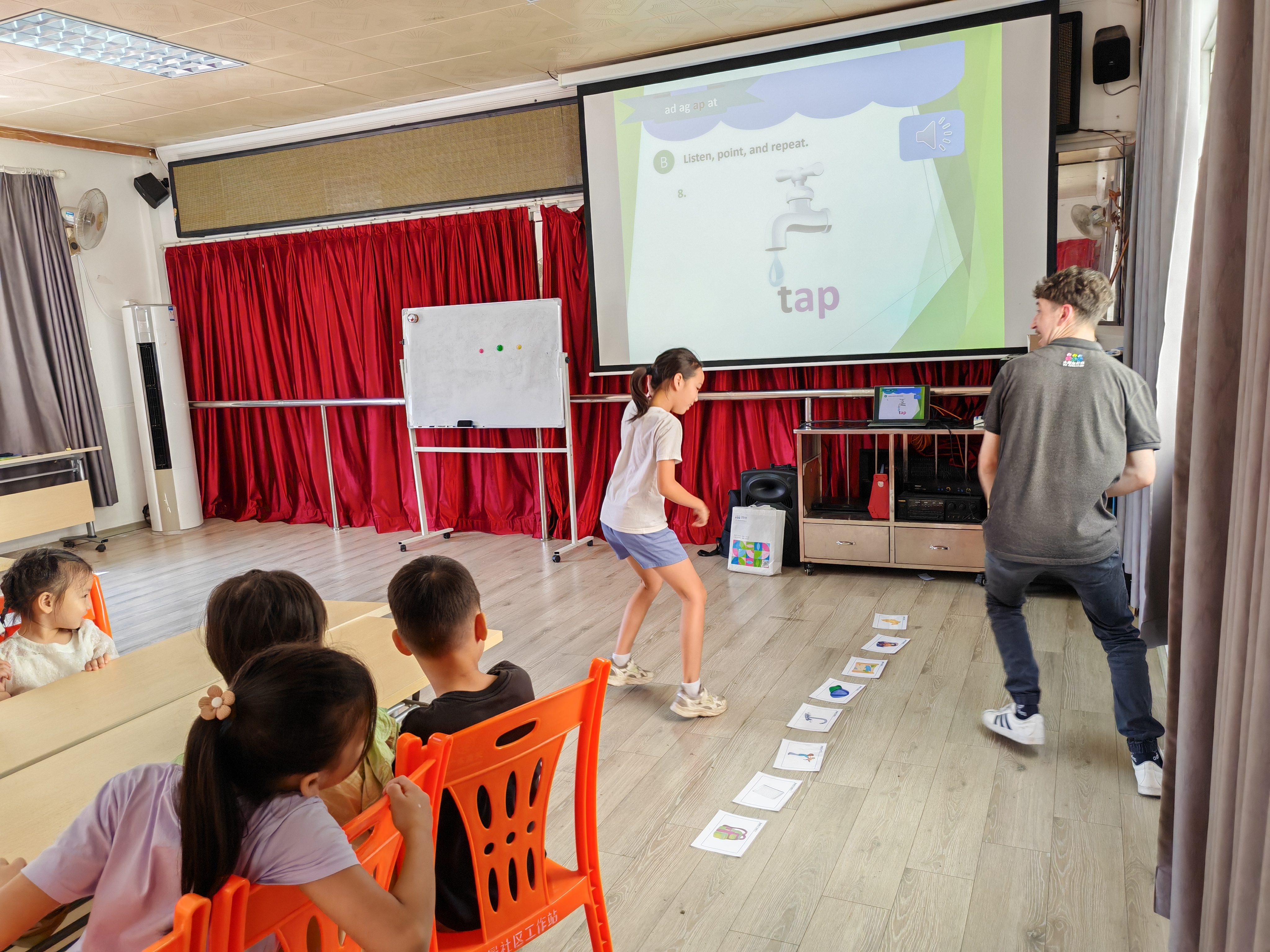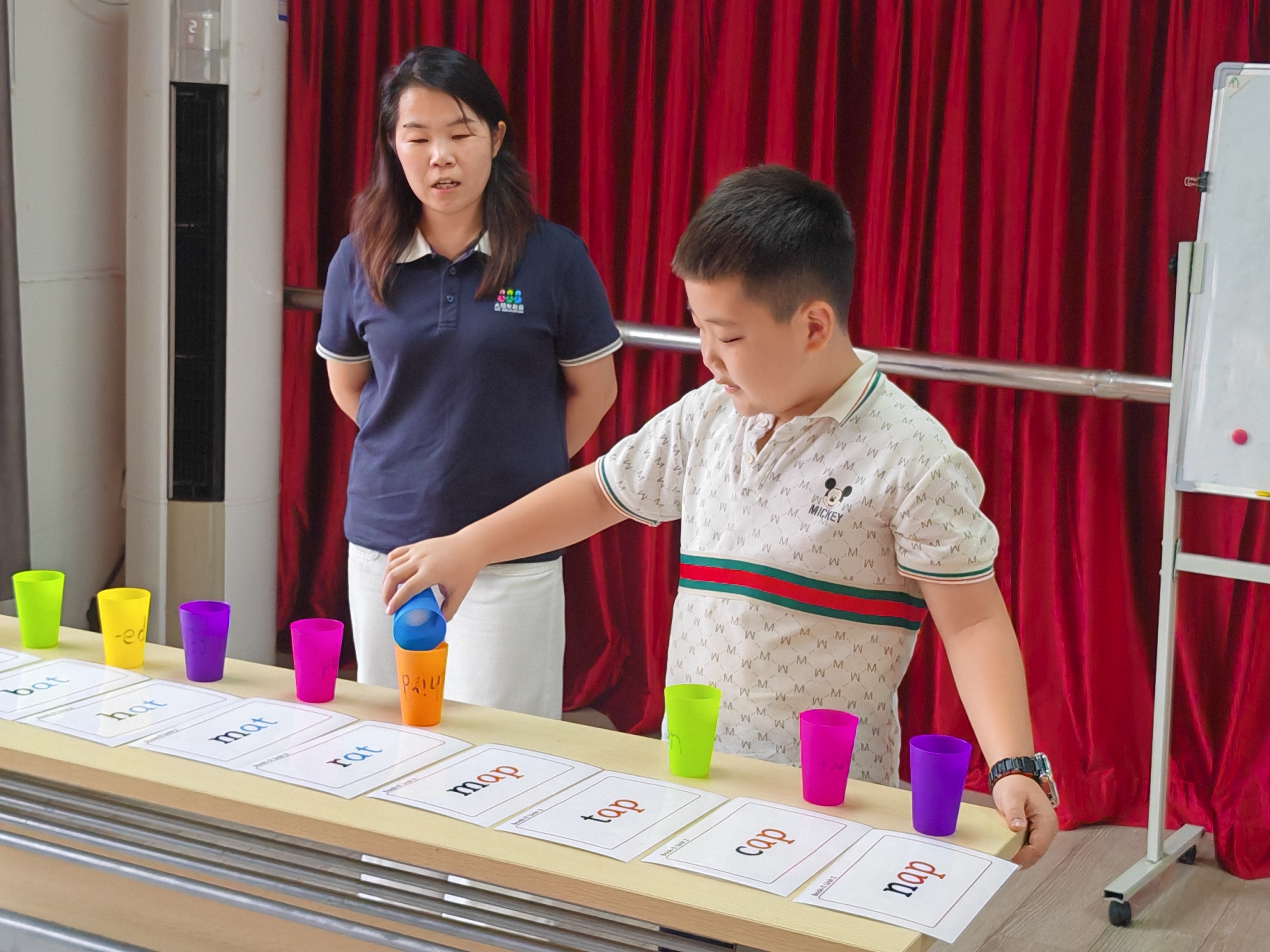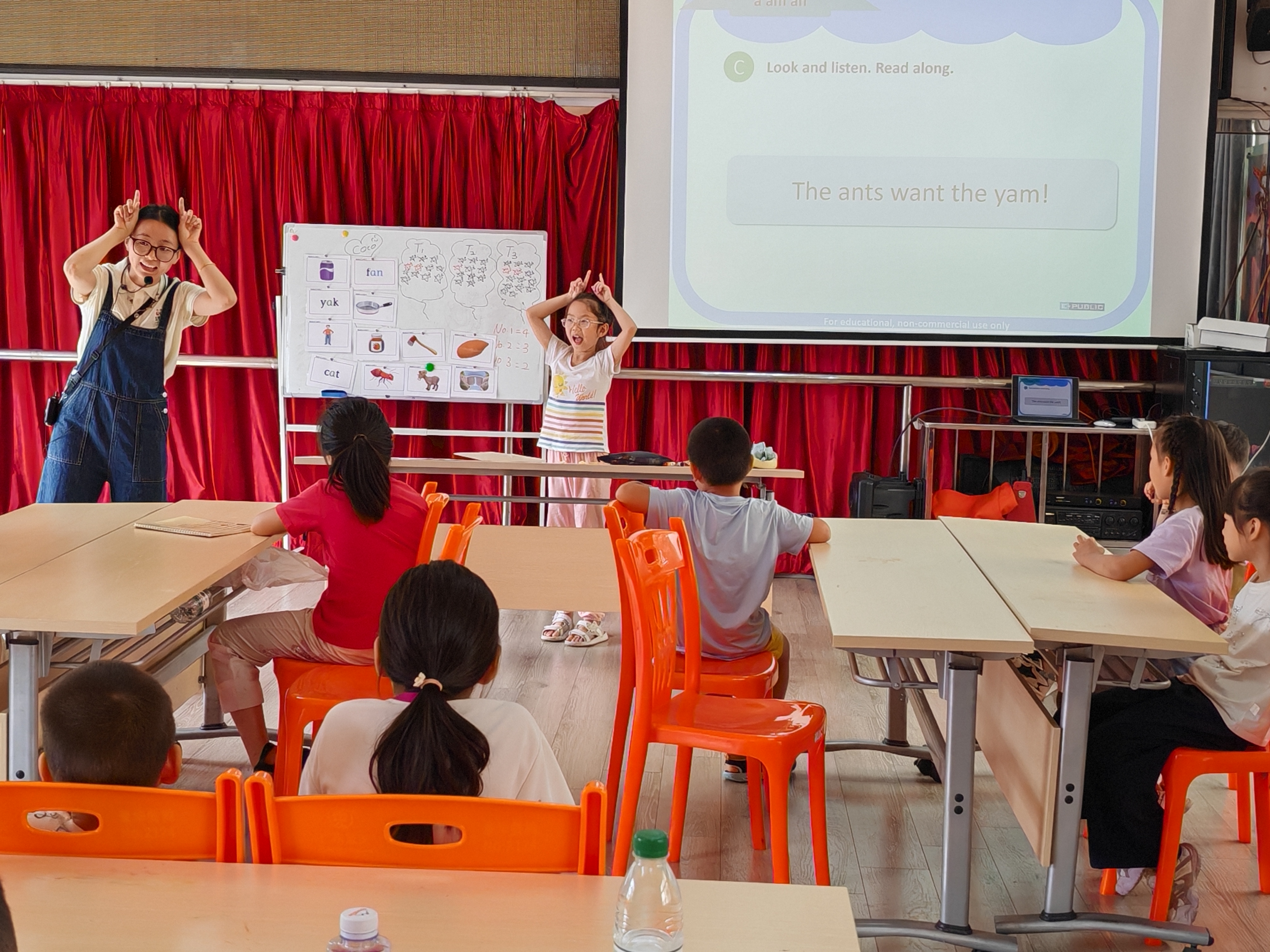 小组前期,主要聚焦短元音a基础学习,老师通过“你画我猜”“击鼓传花”等游戏互动,让孩子们理解和掌握词汇、句子和故事拼读,并通过积分券激发孩子们的学习积极性。