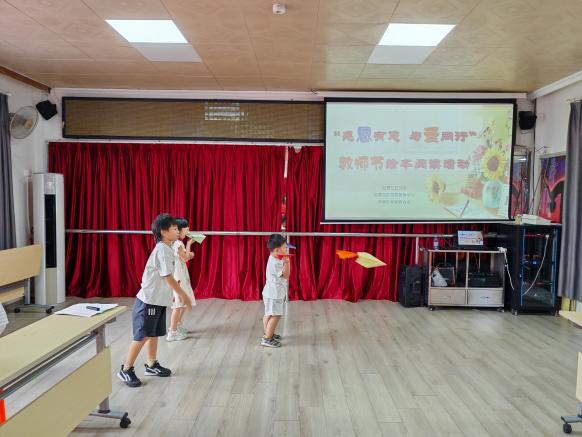 互动提问环节更是精彩纷呈。“9月10号是什么日子?”“你能用一种动物形容老师吗?”孩子们踊跃举手,有的说老师像“温柔的绵羊”,有的说老师像“敏捷的猎豹”,稚嫩的回答中满是对老师的喜爱。现场还设置了“画心中的老师”“折纸飞机寄心意”环节,孩子们用画笔勾勒老师的模样,用彩纸折出承载祝福的纸飞机,将对老师的感恩之情融入作品之中。