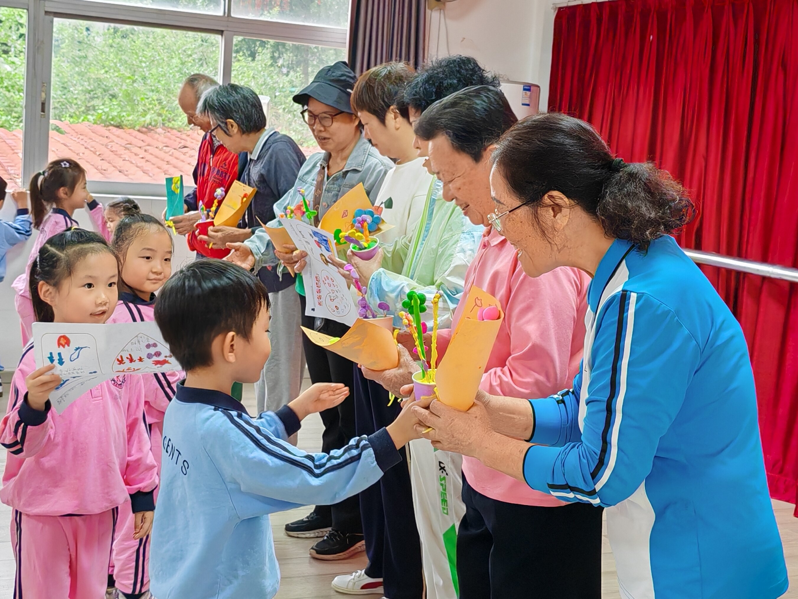 舞蹈表演结束后,进入了温馨的手工礼物赠送环节,每一朵手工花束、每一张贺卡,都是孩子们利用课余时间精心制作的。他们用小小的手,描绘出对老人的祝福,传递着最纯粹的善意。当老人接过这份充满童真的礼物时,脸上的笑容是对孩子心意最温暖的回应。