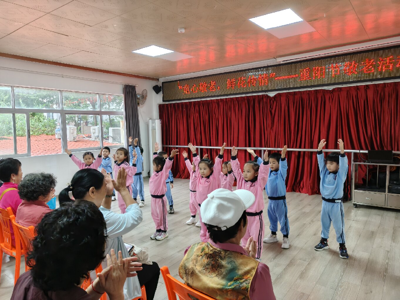 舞台上,幼儿园小朋友们的舞蹈表演活力满满。他们用童真的语言和舞蹈,为现场老人带来了一场视觉与心灵的双重愉悦。台下老人看得专注,时而跟着节奏轻轻拍手,时而拿出手机记录下这可爱的一幕,现场欢声笑语不断。