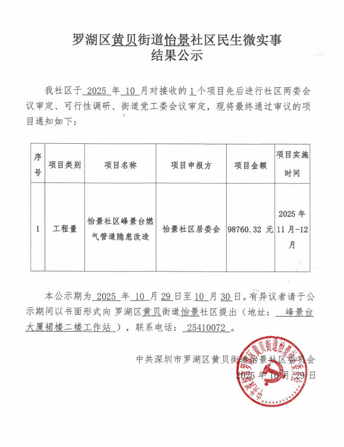 罗湖家园网讯:我社区于 2025 年 10 月对接收的1个项目先后进行社区两委会议审定、可行性调研、街道党工委会议审定,现将最终通过审议的项目通知如下: