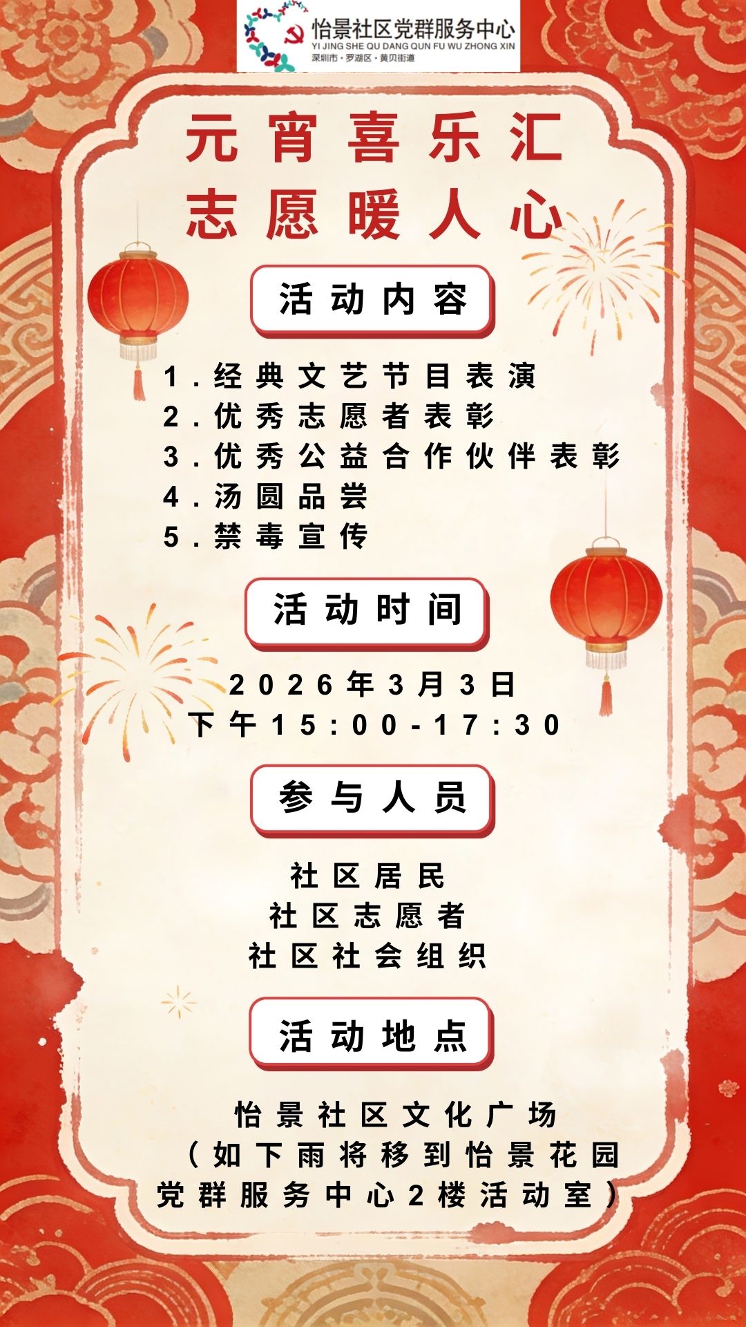 罗湖家园网讯:各位居民朋友,3月3日(星期二)下午15:00-17:30将在怡景社区文化广场举办“元宵喜乐汇,志愿暖人心”元宵节暨志愿者表彰活动,届时将有经典文艺节目表演、优秀志愿者表彰、优秀公益合作伙伴表彰、禁毒宣传、汤圆品尝等,欢迎各位居民前来参与。