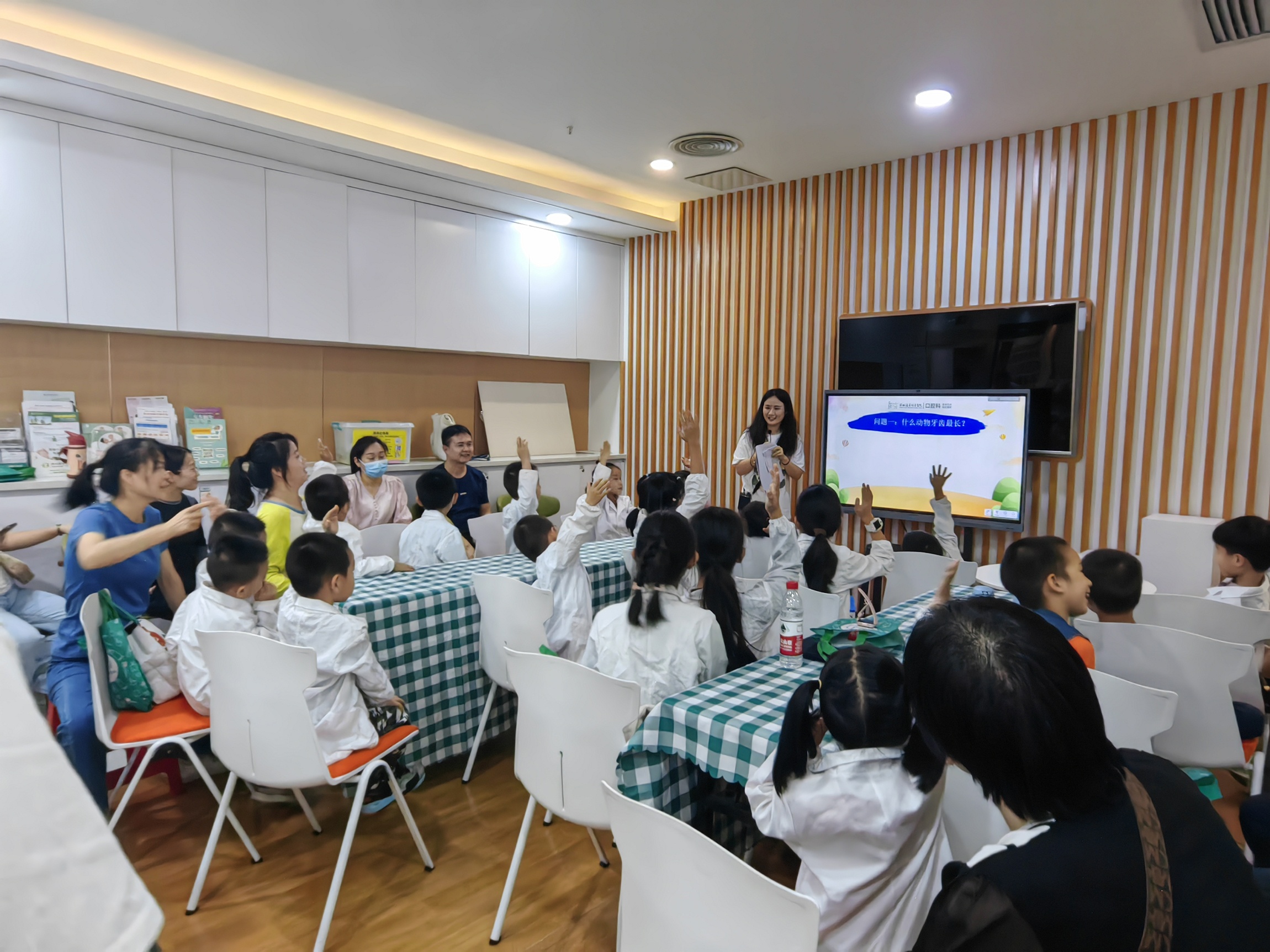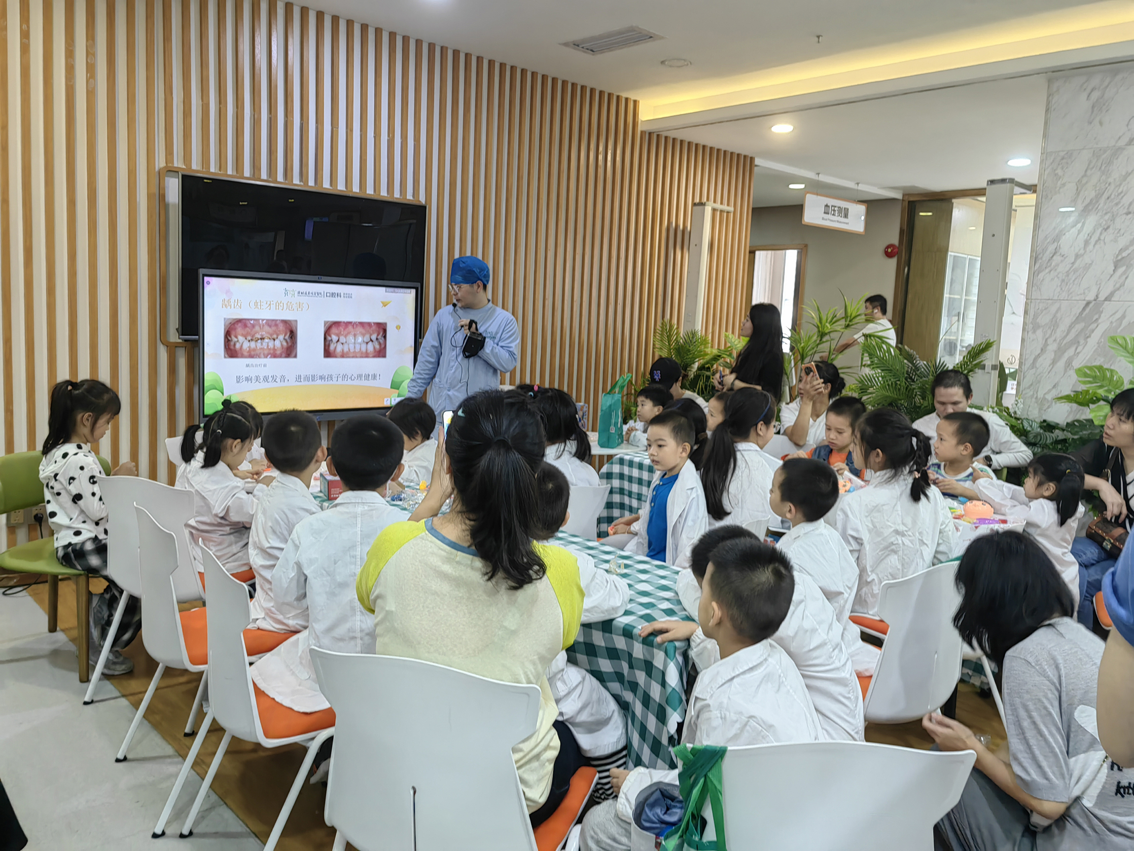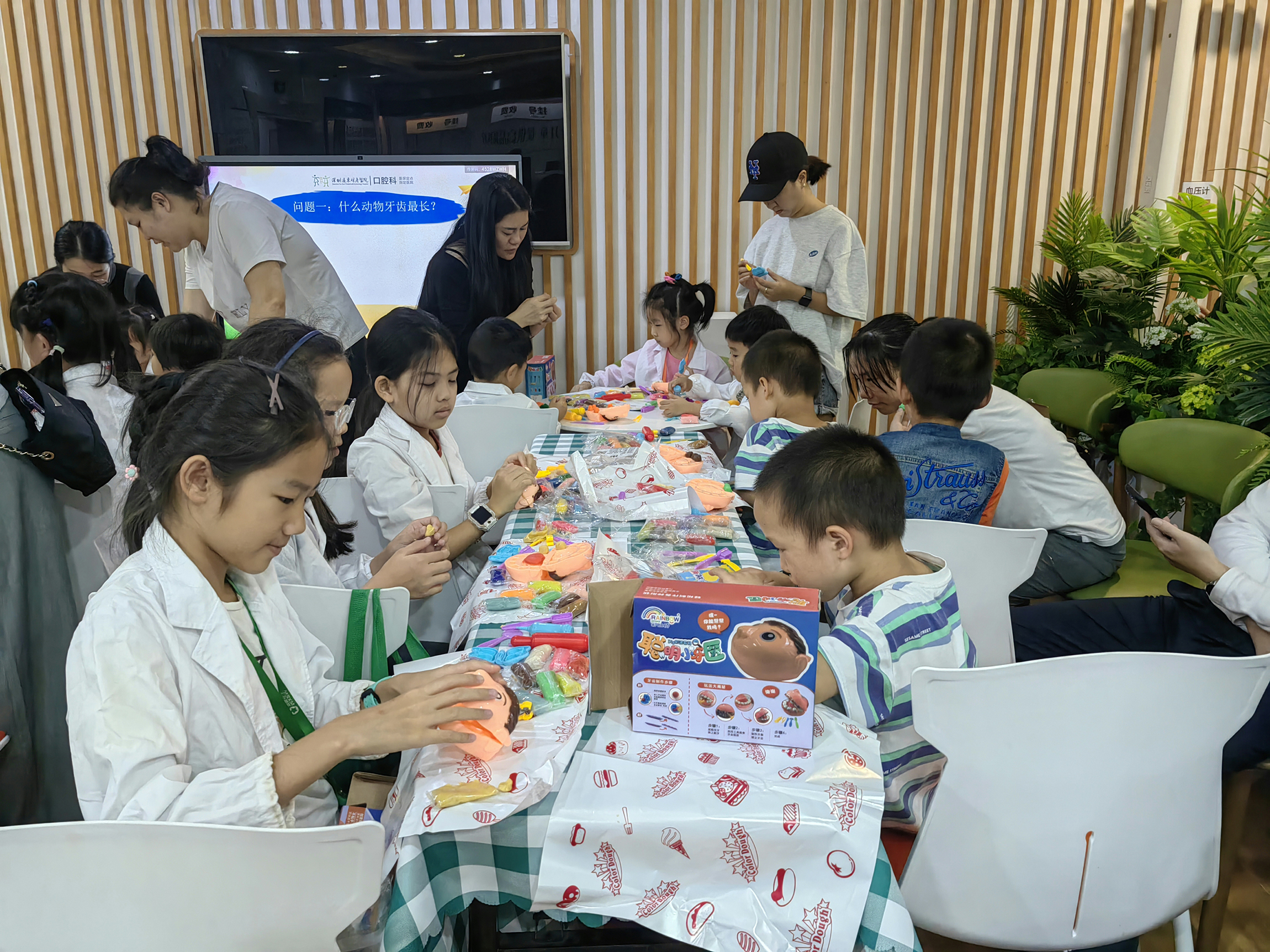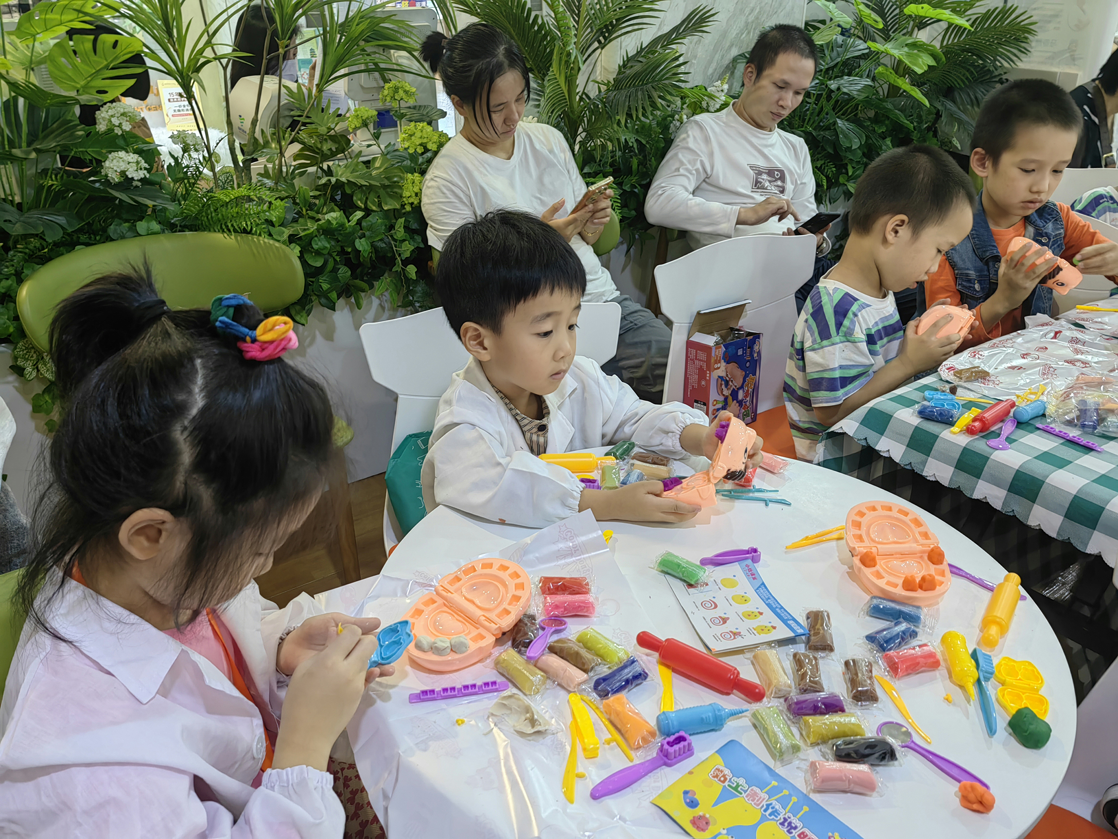 活动开始,小朋友们在家长陪同下有序签到,随后换上可爱的小医生衣服,瞬间化身为一个个专业 “小牙医”。专业牙科医生先是进行了刷牙法科普宣教,通过生动有趣的讲解和示范,让孩子们明白了正确刷牙的重要性及方法。随后,刷牙比赛火热开场,小朋友们纷纷按照所学认真刷牙,现场气氛热烈。紧接着,工作人员为大家准备了一场精彩纷呈的知识问答竞赛抽奖活动。孩子们分成小组,每回答对一个问题,就能获得一个小奖品。这不仅让孩子们在轻松愉快的氛围中巩固了之前学到的口腔保健知识,更让整个活动充满了趣味性和挑战性彩泥牙齿。最受欢迎的DIY 手工制作环节来了,孩子们发挥创意,用彩泥打造出形态各异的牙齿作品,在欢乐中加深了对牙齿的认知。最后,大家来到科室进行检查体验,在专业医生引导下,孩子们不再害怕,勇敢尝试,进一步了解自己的口腔健康情况。