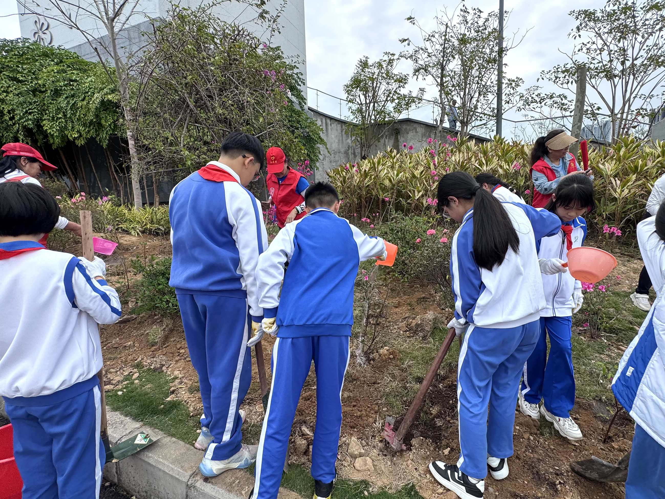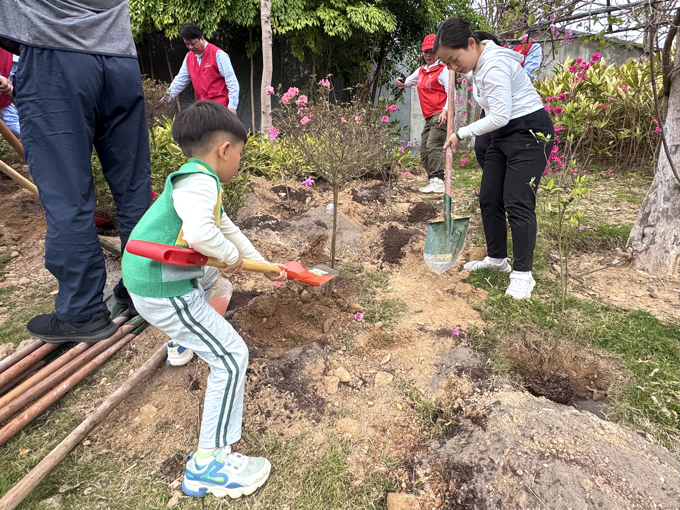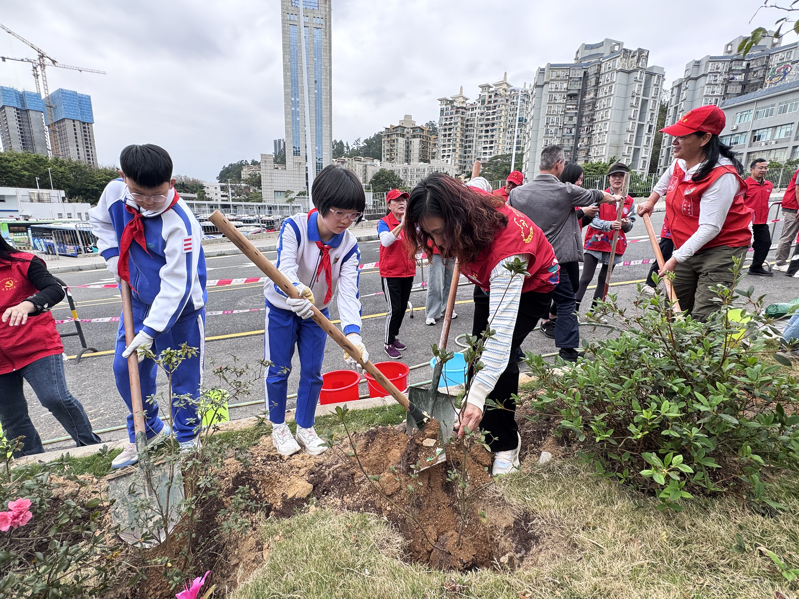 活动当天,天气宜人,微风和煦,正是植树的好时节。在梧桐山风景管理处党总支书记对植树要领与注意事项的细致讲解后,大家迅速分工,或挥锄挖坑,或扶树培土,还有的提桶浇水,一派热火朝天的劳动景象。特别是仙桐实验小学的学生代表们,虽然年纪尚小,但干劲十足,在老师和家长的指导下,小心翼翼地将一棵棵树苗植入土中,不仅体验了劳动的乐趣,还实现了从“自然课堂”到“劳动教育”的生动转化。