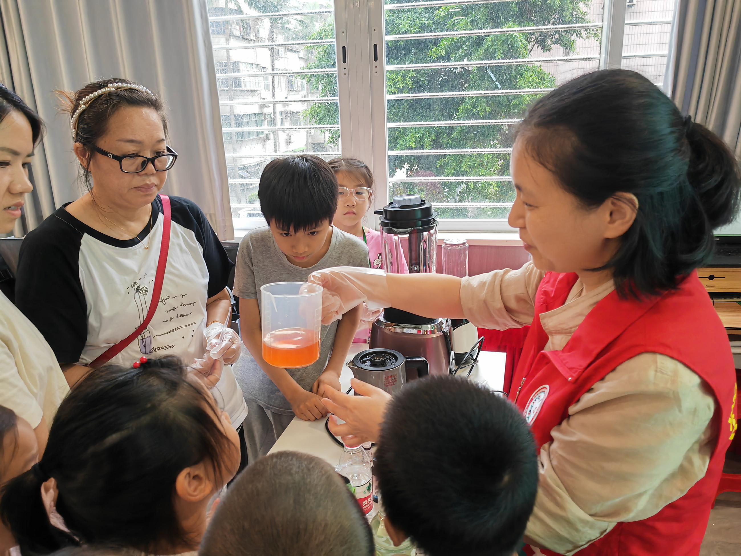 在知识讲解后,活动进入令人期待的实践环节。营养师现场演示用色素、糖浆等原料调制可乐和橙汁,揭开市售饮料的 “神秘面纱”,直观展示人工添加剂的使用过程。随后,大家在营养师指导下,共同动手用新鲜水果制作天然果汁。看着新鲜水果在榨汁机中变成色彩鲜艳、香气四溢的饮品,孩子们兴奋不已。通过对比人工调制饮品与新鲜果汁,大家深刻认识到天然饮品的健康优势。