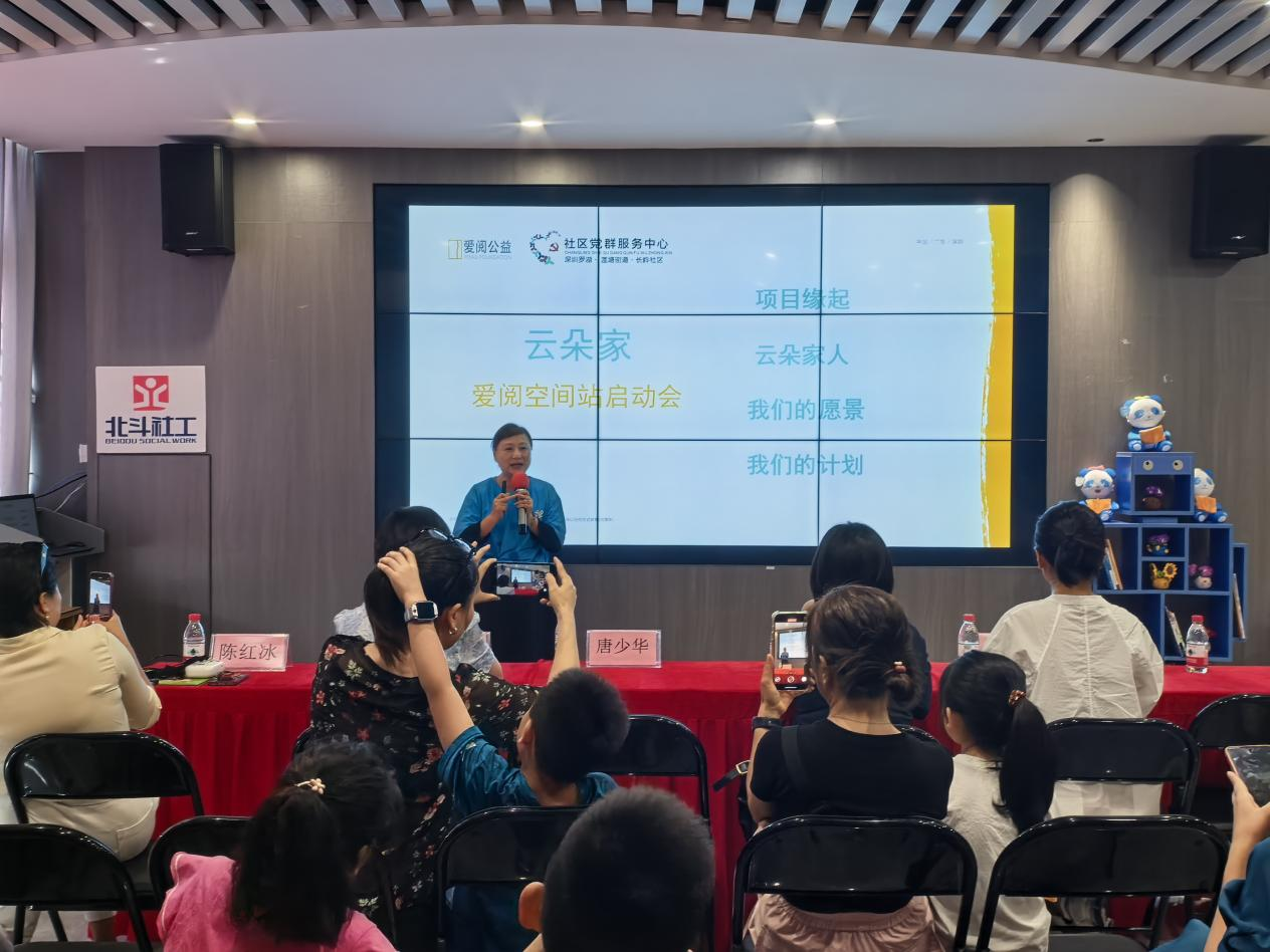长岭社区讯:为让更多儿童从小爱上阅读、学会阅读,7月14日下午,在长岭社区党委支持下,北斗机构驻长岭社区党群服务中心社工团队积极链接辖区内外资源,与爱阅基金会、辖区热心居民牵手,成立“云朵家”爱阅空间站项目,长岭社区党委代表、辖区幼儿园、爱阅公益基金代表、云朵家讲师成员以及辖区儿童共30人参加此次项目启动会。