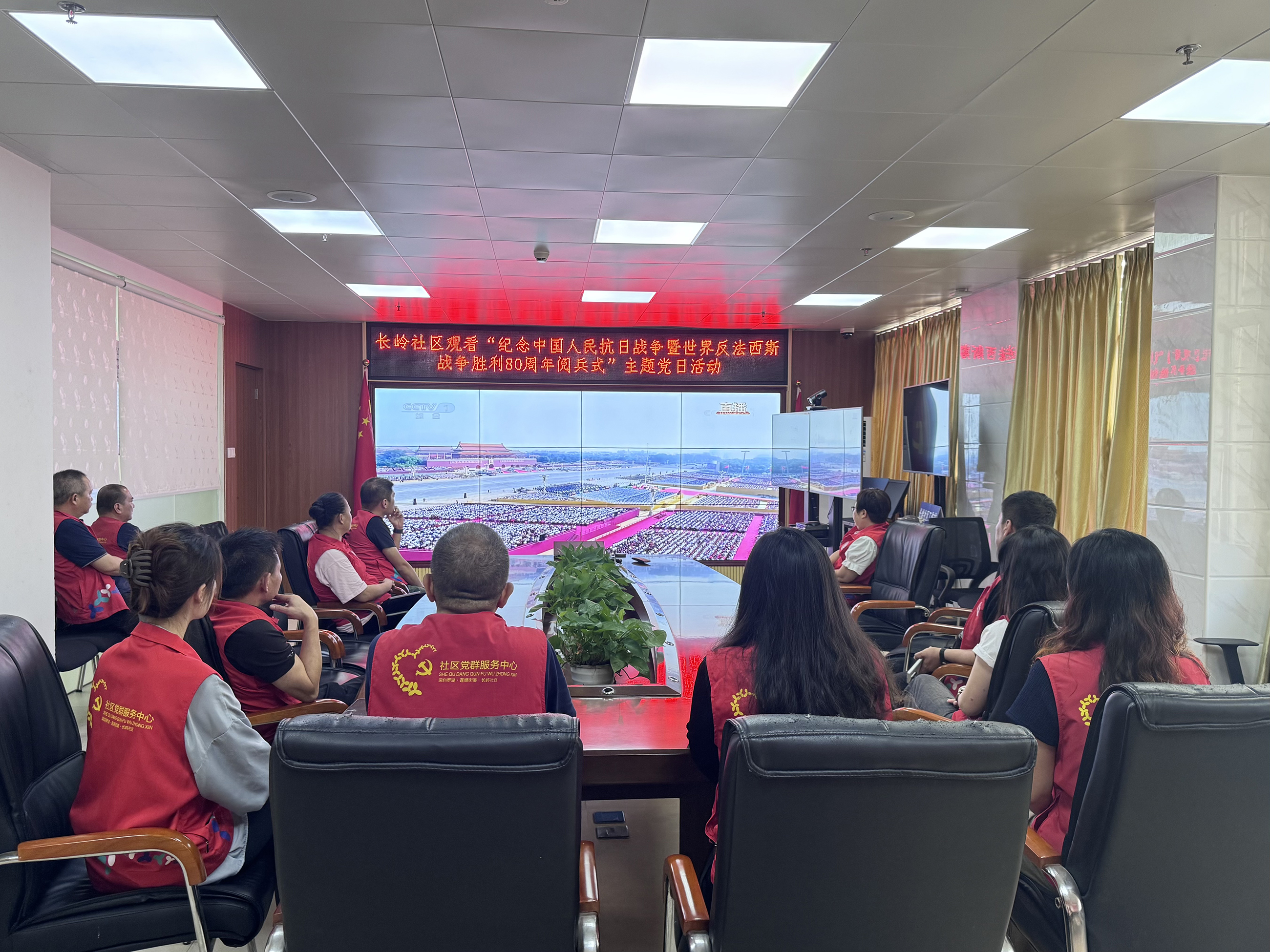 长岭社区讯:为铭记中国人民抗日战争暨世界反法西斯战争的伟大胜利,弘扬抗战精神,厚植爱国主义情怀,长岭社区党委于2025年9月3日组织社区党员、居民群众及新就业群体代表,分别在社区党群服务中心和暖蜂驿站集中观看“纪念中国人民抗日战争暨世界反法西斯战争胜利80周年大会”直播,共同回顾历史荣光,汲取奋进力量。