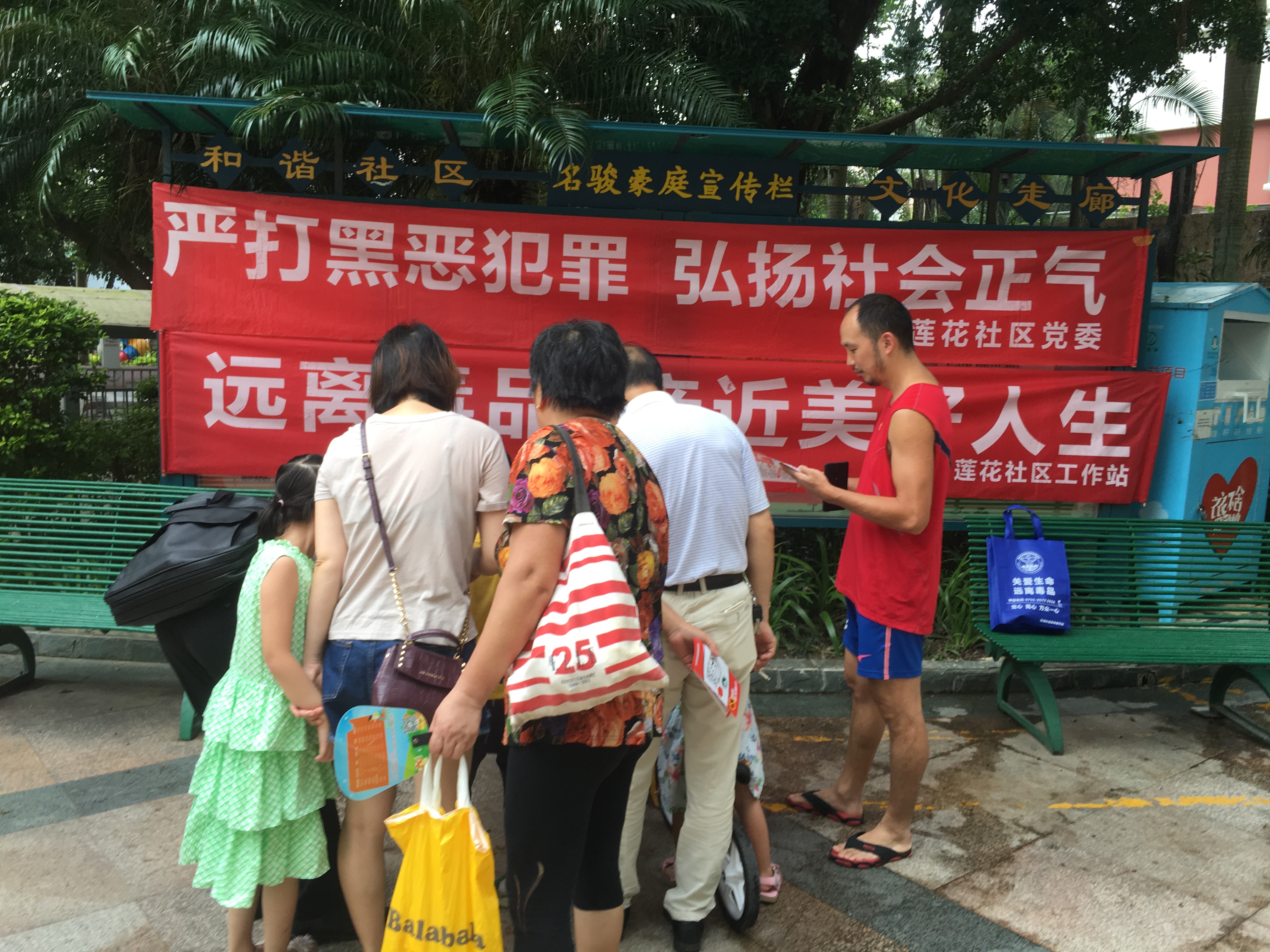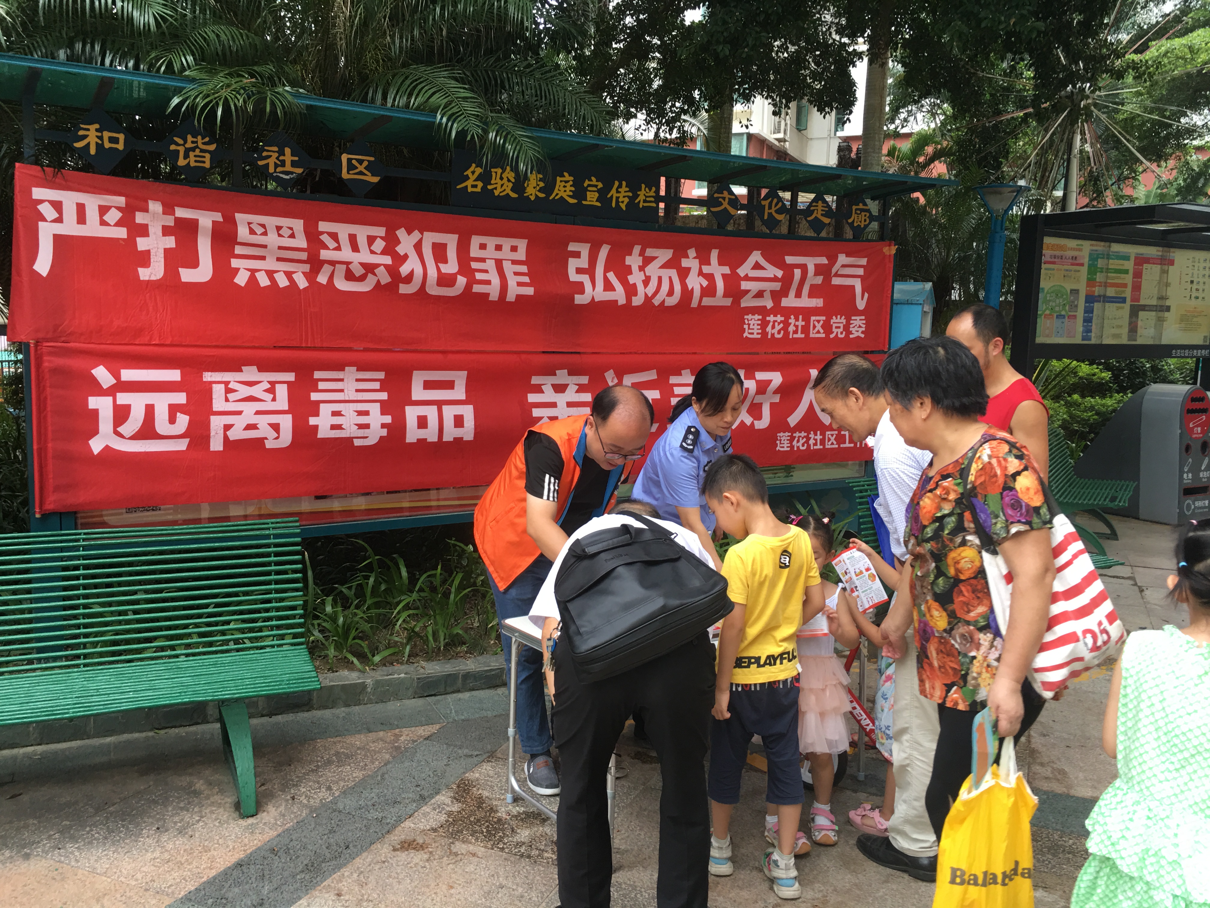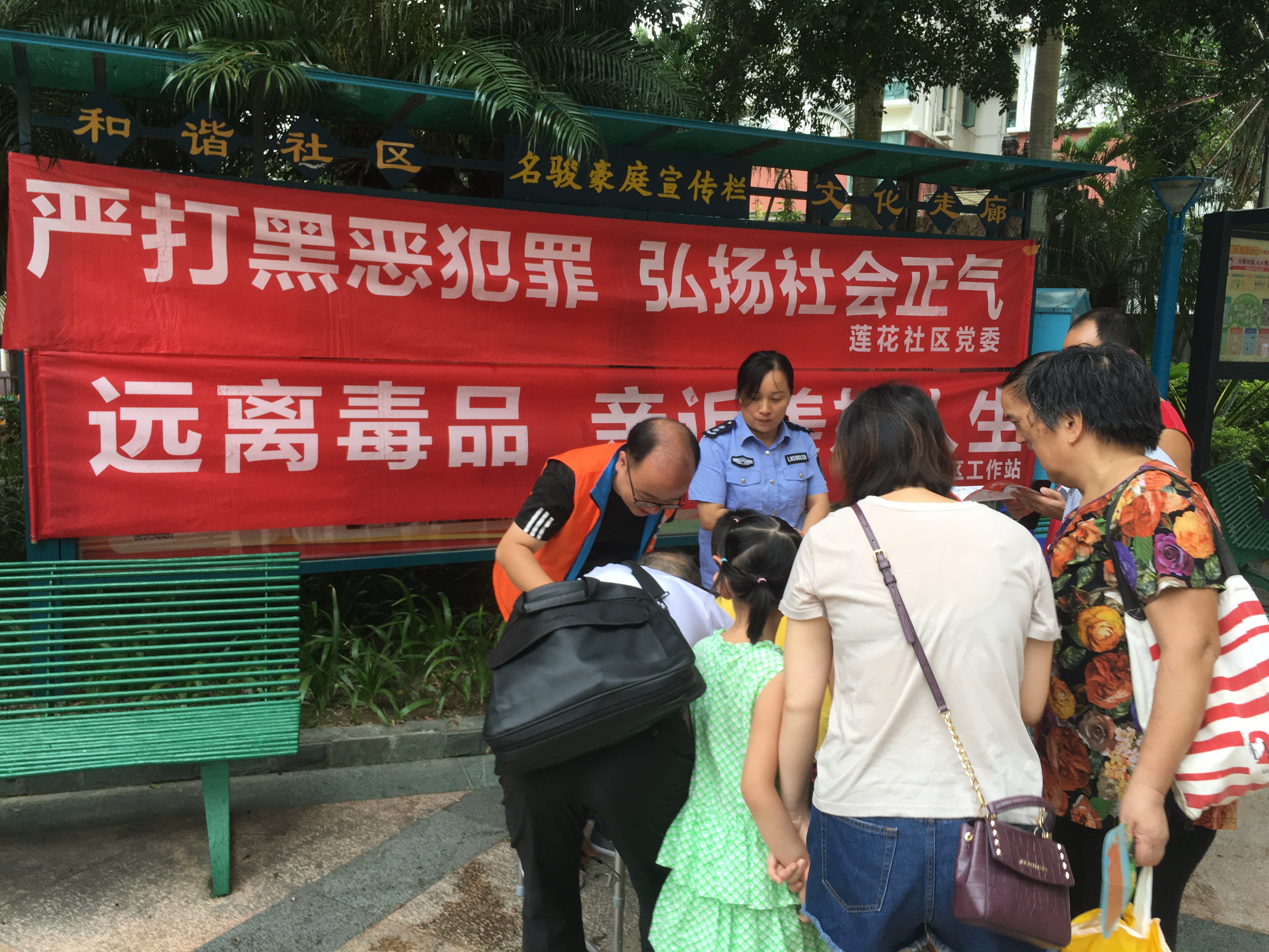 为进一步普及禁毒知识,增强广大居民群众的识毒、防毒和拒毒的能力。2019年8月23日上午,莲塘街道莲花社区组织禁毒社工和网格员,在名骏豪庭广场开展以“手拉手远离毒品 心连心造福社会”为主题的禁毒宣传教育活动。