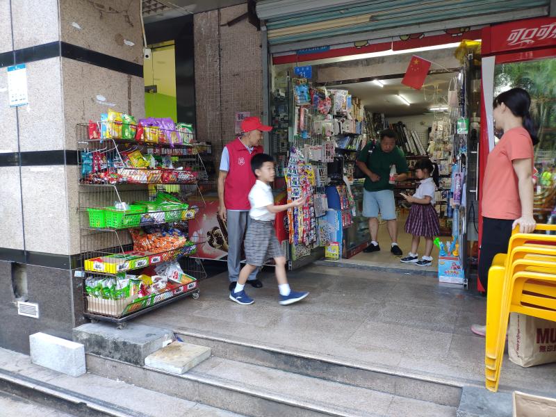 服务开展第一天,义工们请进入商店购物后的孩子们记得将垃圾扔进垃圾桶,孩子们都非常配合。有两个女孩子买了棒棒冰本来不会那么快吃一听赶紧把包装拆了扔到垃圾桶;还有个饿极了的男孩将香肠一口吃了竹签随手就扔到了地上,一听义工爷爷奶奶的话赶忙又从地上将竹签捡起来扔垃圾桶了。义工们的服务得到了各商铺店主店员和物业保洁的一致点赞。保洁阿姨乐呵呵的说平时这个点她的簸箕要装倒五次还不够,今天一次都没装满呢。