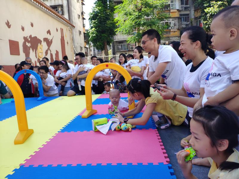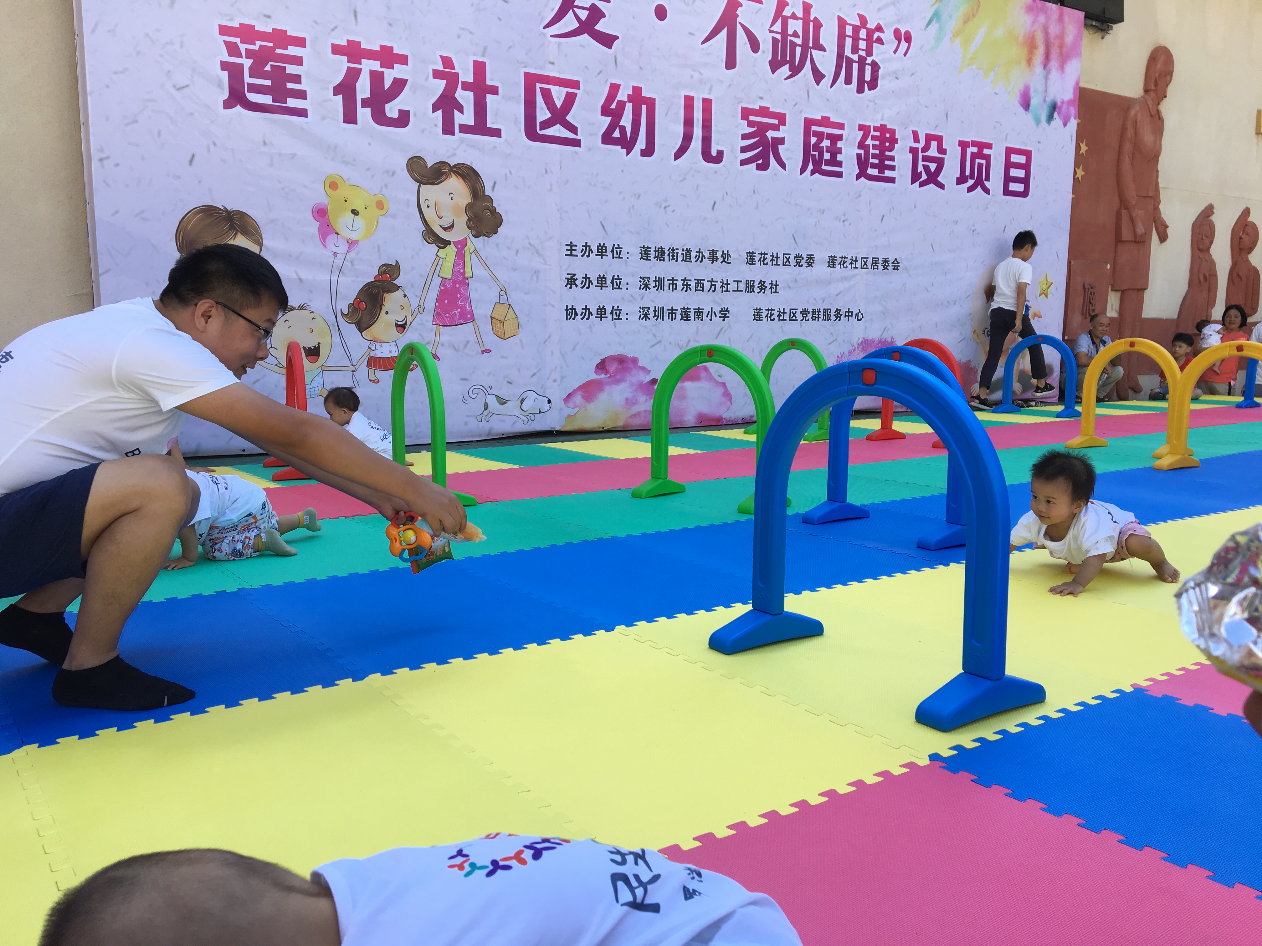 本次活动由罗湖区莲塘街道办事处、莲花社区党委、莲花社区居委会主办,深圳市东西方社工服务社驻莲花社区党群服务中心全体社工承办,莲南小学协办。来自社区的35个家庭(36个宝宝)全程参与了这场活动。活动内容主要是以家庭为单位的亲子活动,主要为父母引导二岁以下幼儿进行爬行比赛,力争做到在搭建朋辈关系的同时又能让亲子家庭玩的开心!为了加强民生微实事的宣传以及在社区居民中的影响力,社工们两个月前就在社区各个居民小区进行现场动员以及实地采访宣传,并且特别定制了印有民微LOGO的亲子T恤!使这个项目能真正贴近居民的真实需求。