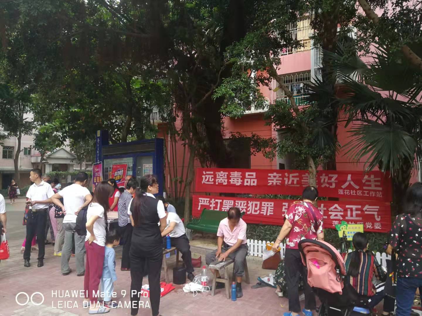 为持续推进扫黑除恶以及禁毒宣传工作,推广扫黑除恶行动以及禁毒理念,提高居民的参与度以及毒品防范意识。2019年10月28日,莲花社区组织禁毒社工及网格员,在桐景花园广场开展一场扫黑除恶、禁毒宣传教育活动。