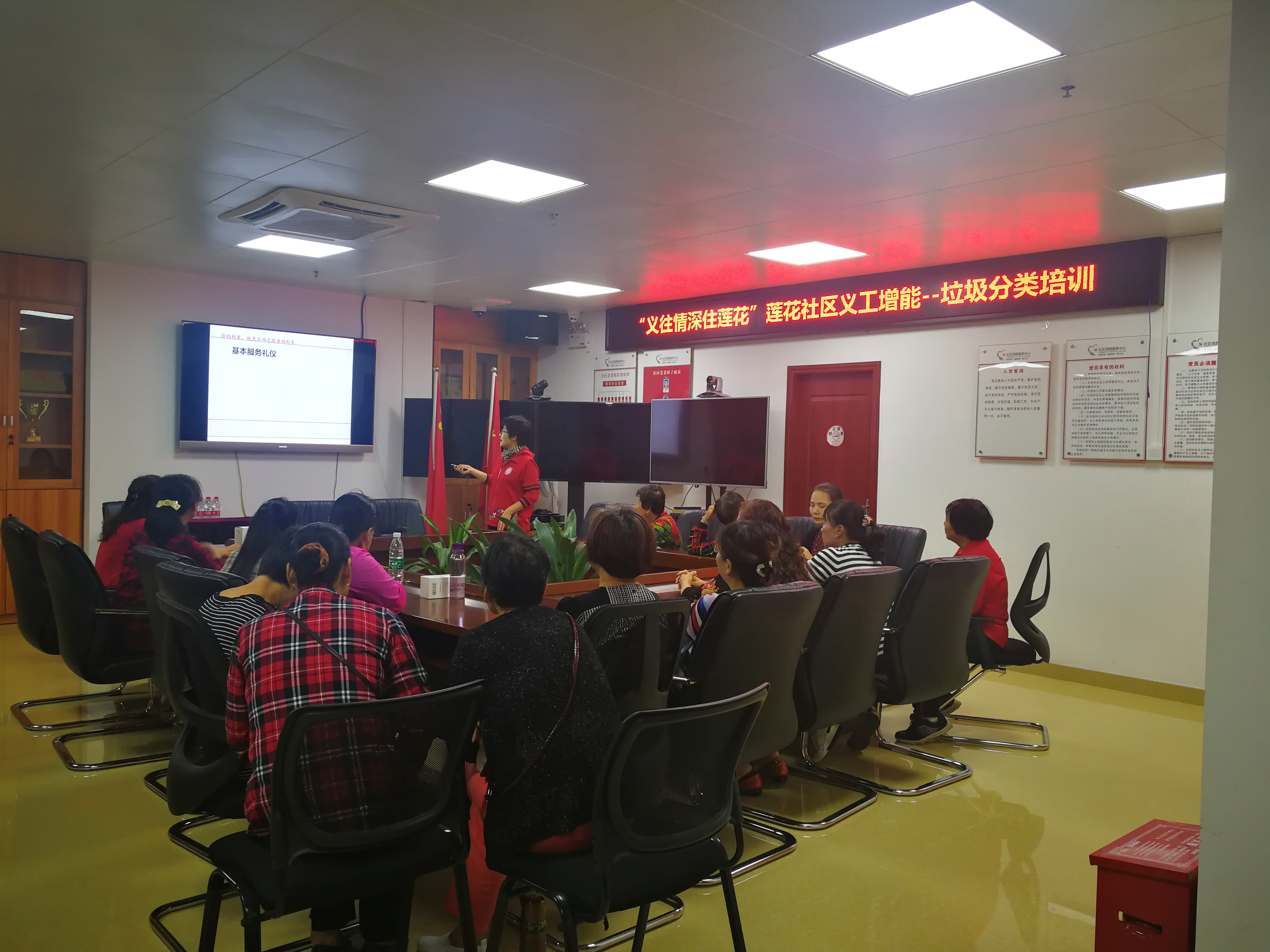 本次培训开始由社工办公室社工带领义工们认真学习社区义工组织纪律和义工服务礼仪,结合莲花社区“578”多元社区治理项目的日常义工服务要求,强调义工们参与服务时形象礼仪和组织纪律的重要性。培训链接到街道办的垃圾分类陈讲师,给参与者详细讲解深圳的垃圾分类相关知识及垃圾的去处;通过全程的投入学习及与讲师的答问沟通。通过培训义工们已能对生活中的常见垃圾进行正确分类,表示愿意做好家庭、居住小区和社区垃圾分类的先行者,同时也愿意给左邻右舍和亲朋好友做些正面宣传。