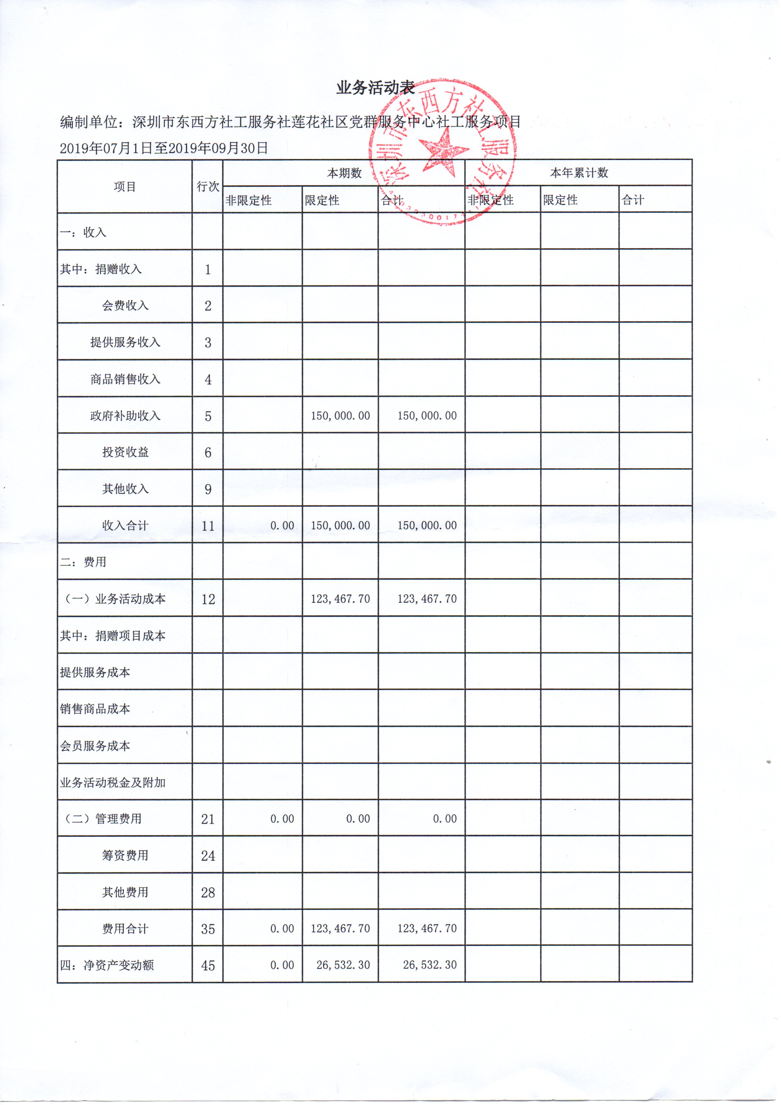 莲花社区党群服务中心社工服务项目2019年第三季度财务公示