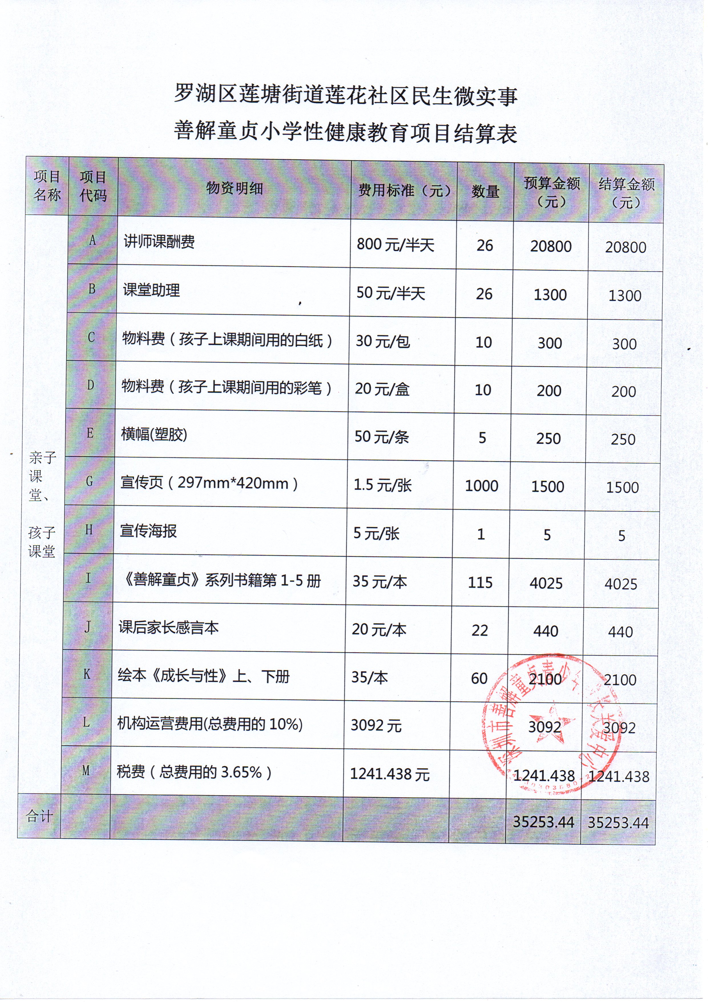 莲花社区善解童贞小学性健康教育项目决算表