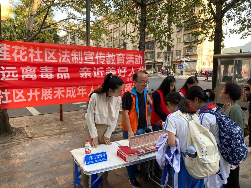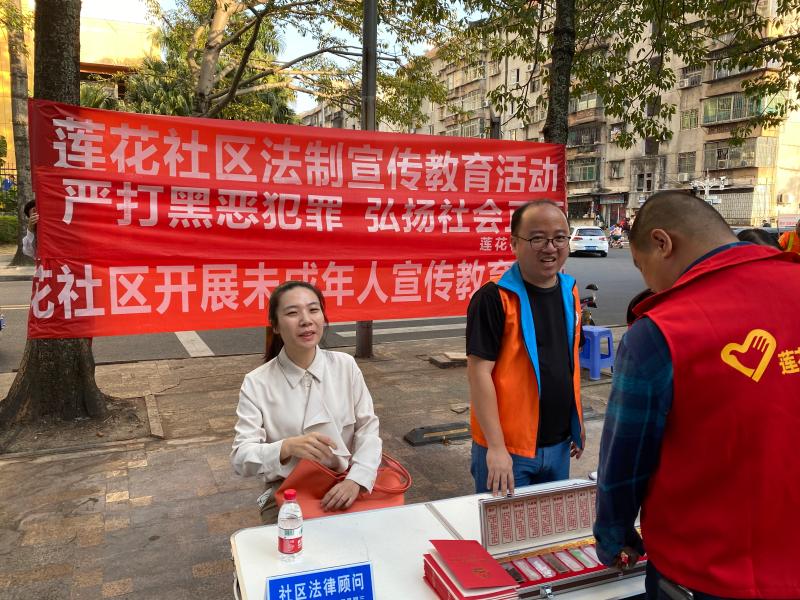 为扎实推进创建文明城市工作并迎接12·4法制宣传日的到来,进一步推进和巩固禁毒及扫黑除恶的工作。2019年11月21日下午4点,莲花社区组织全体工作人员在名骏豪庭平方超市门口开展禁毒、扫黑除恶、法制和创文的宣传教育活动。
