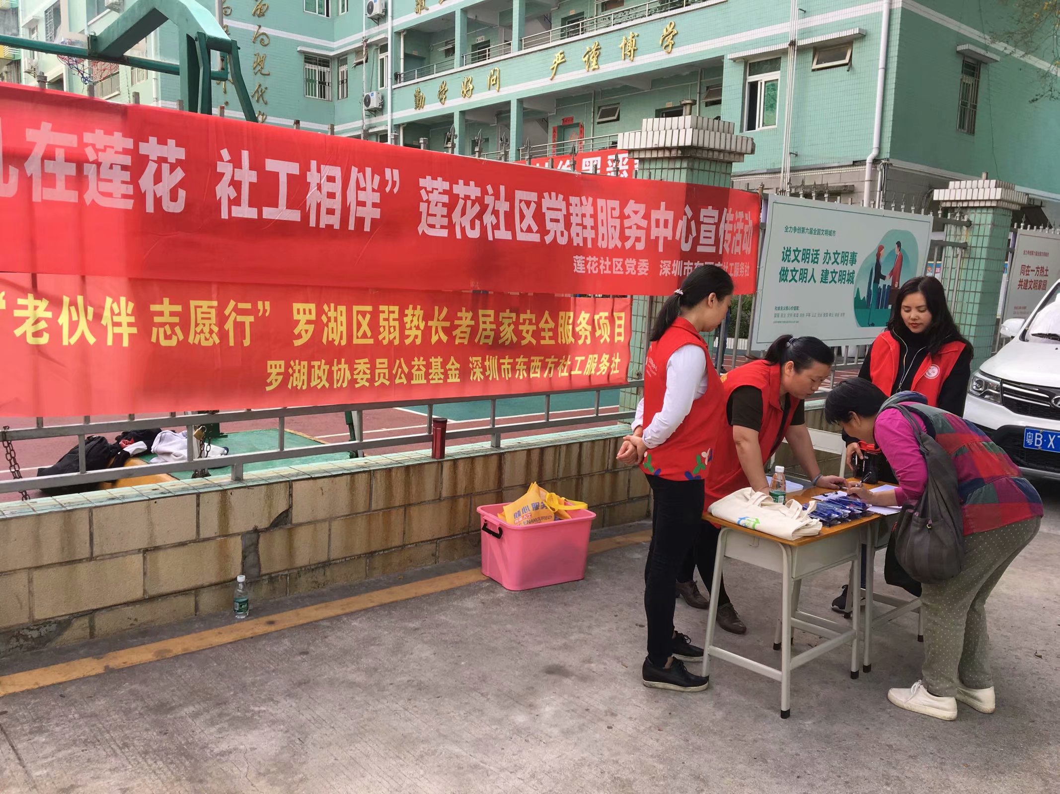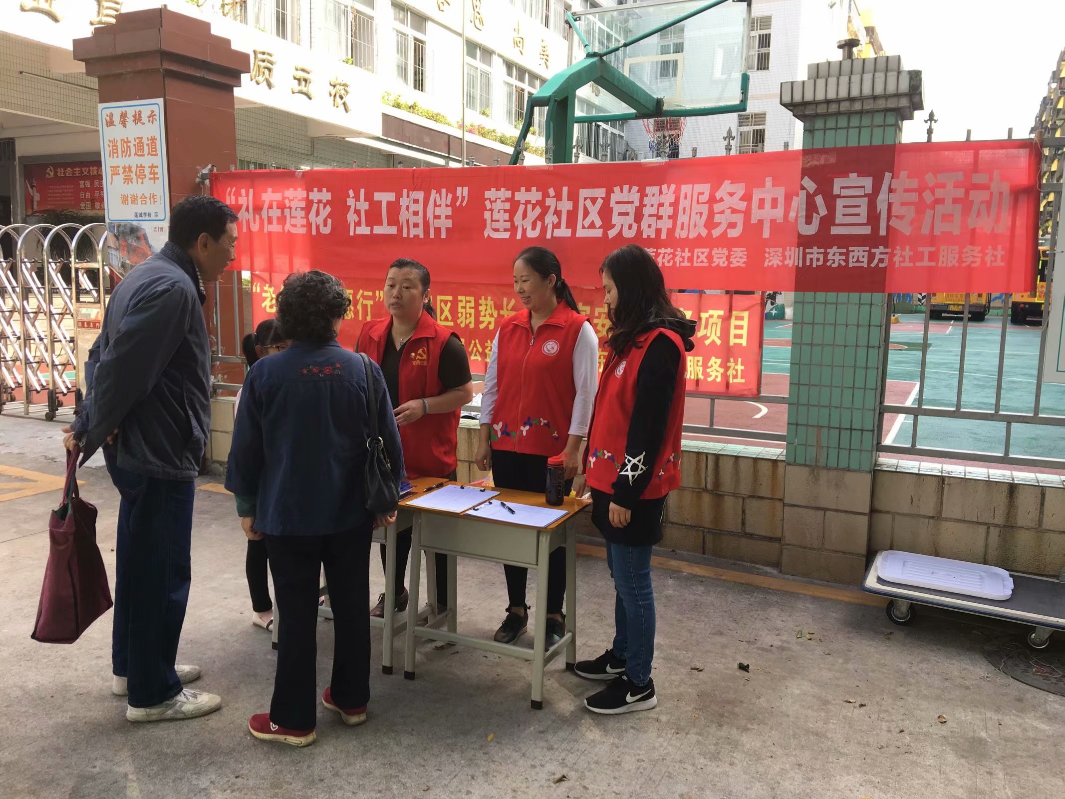 2020年1月11日上午09:00-12:00,莲花社区党委、莲花社区工作站、深圳市东西方社工服务社驻莲花社区党群服务中心社工团队开展的“礼在莲花 社工相伴”莲花社区党群服务中心一月份社工宣传活动在振华苑花园小区广场举办!