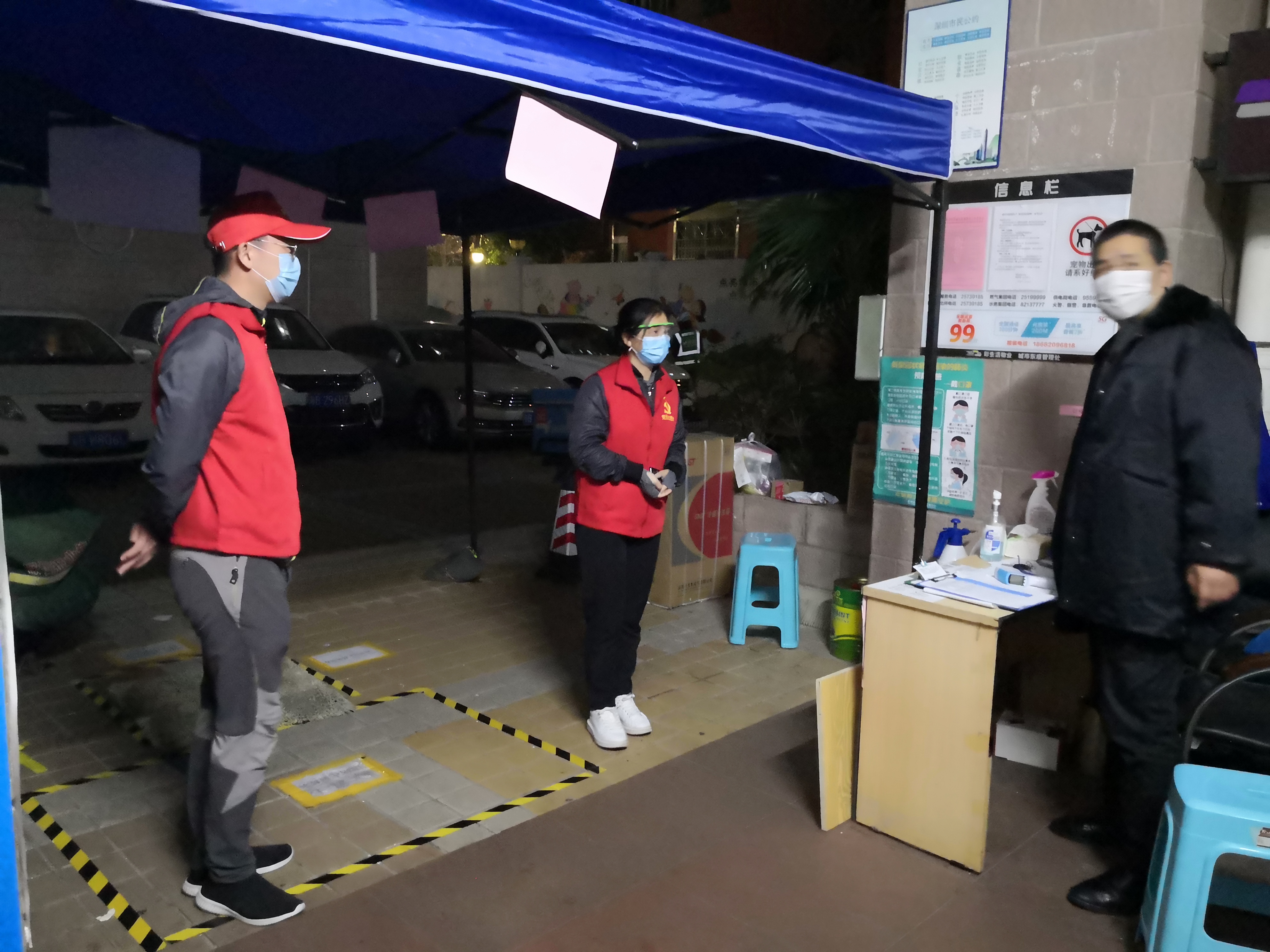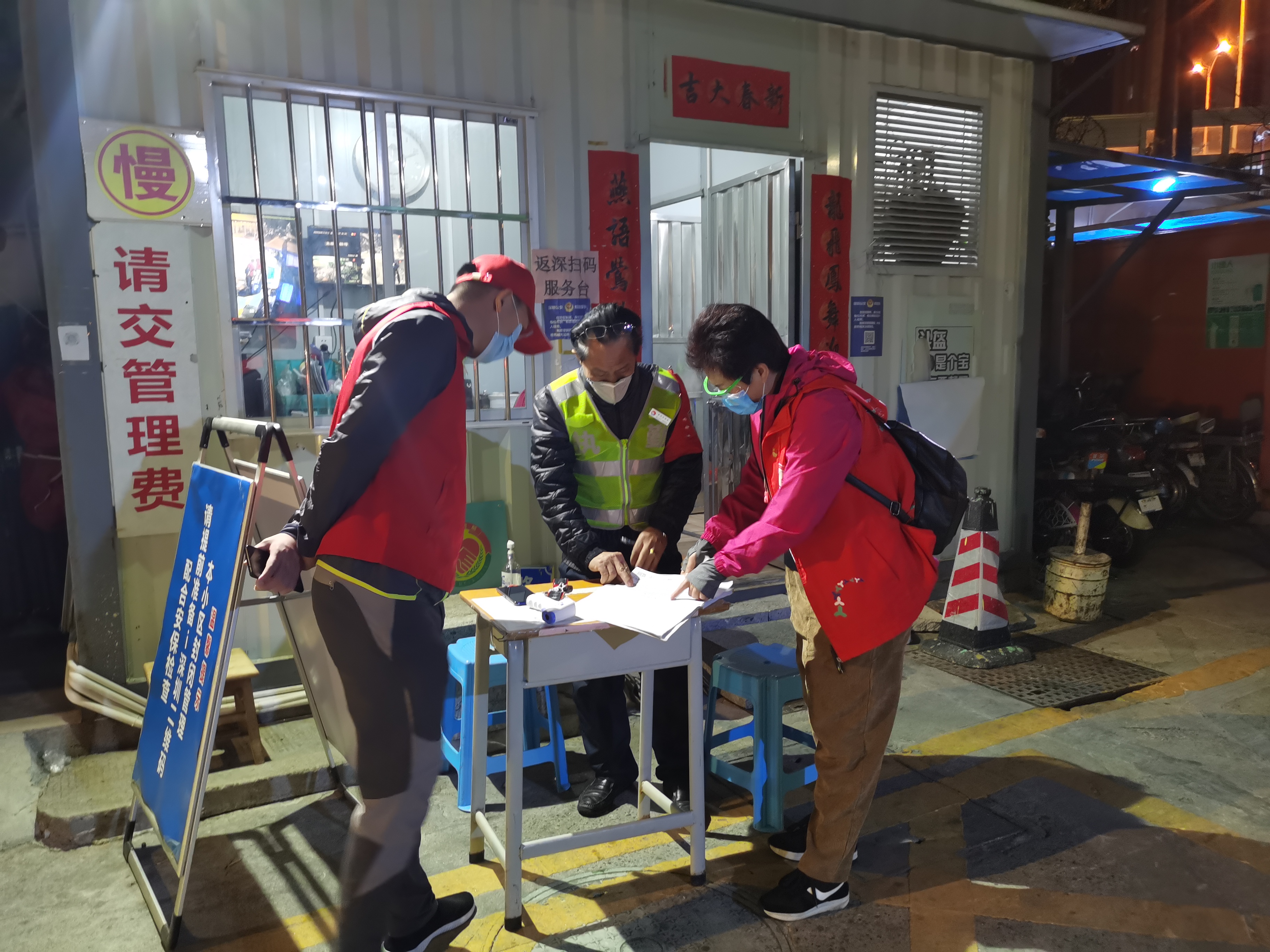 为了更好做好疫情防控工作,各个小区管理处要时刻保持在岗在线心态,认真落实疫情防控各项工作。2020年2月22日晚上,莲花社区夜间巡逻队(区下沉干部柳通与社区党委委员袁春千、卢美珍),到各个小区突击检查居民进出有无测温,落实i深圳二维码的检查情况,查看非疫区返深人员的登记情况。