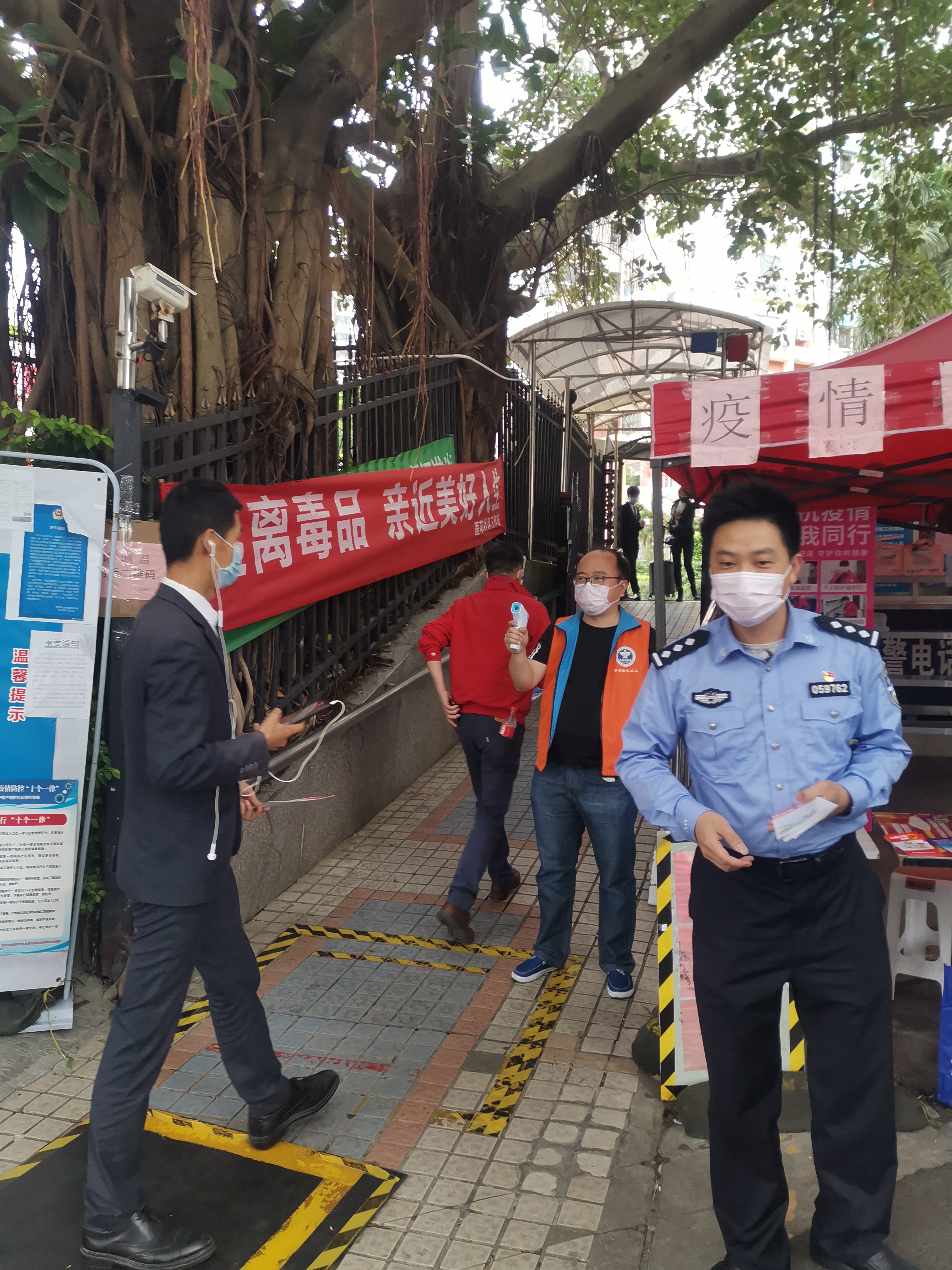 活动中,通过悬挂禁毒横幅,刘文铭警长与禁毒社工及网格员一起向过往居民发放预防新型冠状病毒、禁毒教育宣传资料,并向出入小区的居民测量体温,提醒广大居民要勤洗手、常通风、戴口罩、不扎堆、不聚会;要自觉遵守禁毒相关法律法规,提高自身“识毒、防毒、拒毒”的意识,刘警长并用真实案例告诫居民毒品给自身、家庭、社会带来的严重危害;要谨慎交友,提高对陌生人的警惕性,引导家人、朋友们珍爱生命、远离毒品。