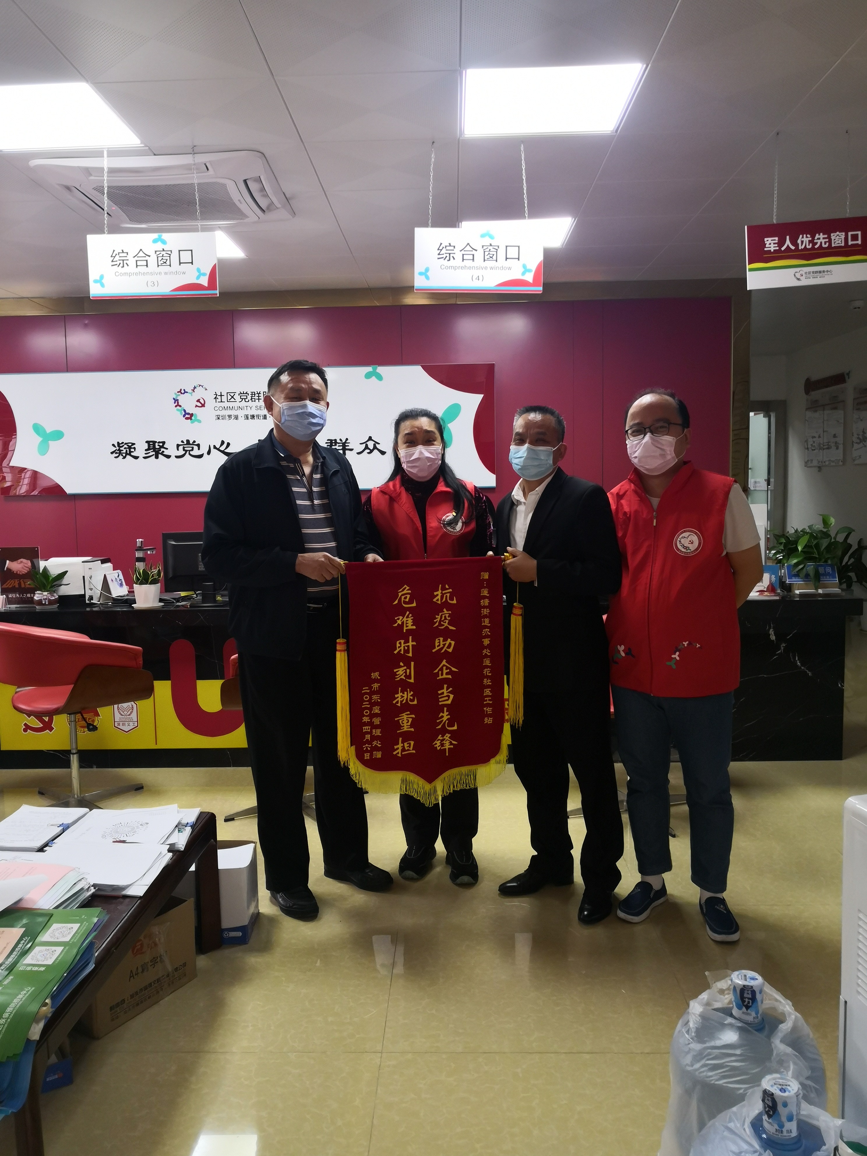 2020年4月8日下午,莲花社区工作站收到城市东座管理处主任送来的“抗疫助企当先锋 危难时刻挑重担”的锦旗,感谢日夜坚守在疫情防控一线守护居民安全和健康的社区工作人员。
