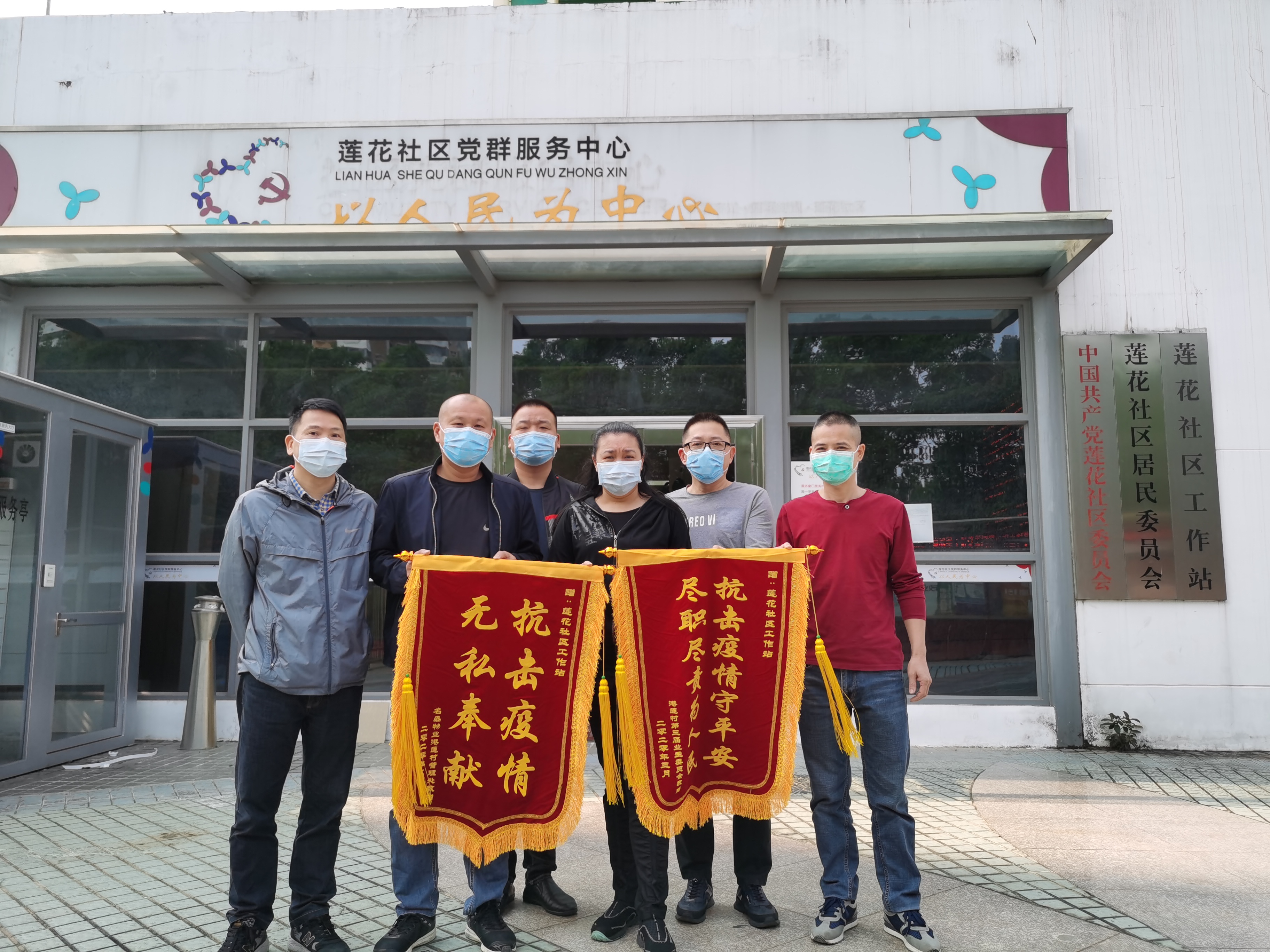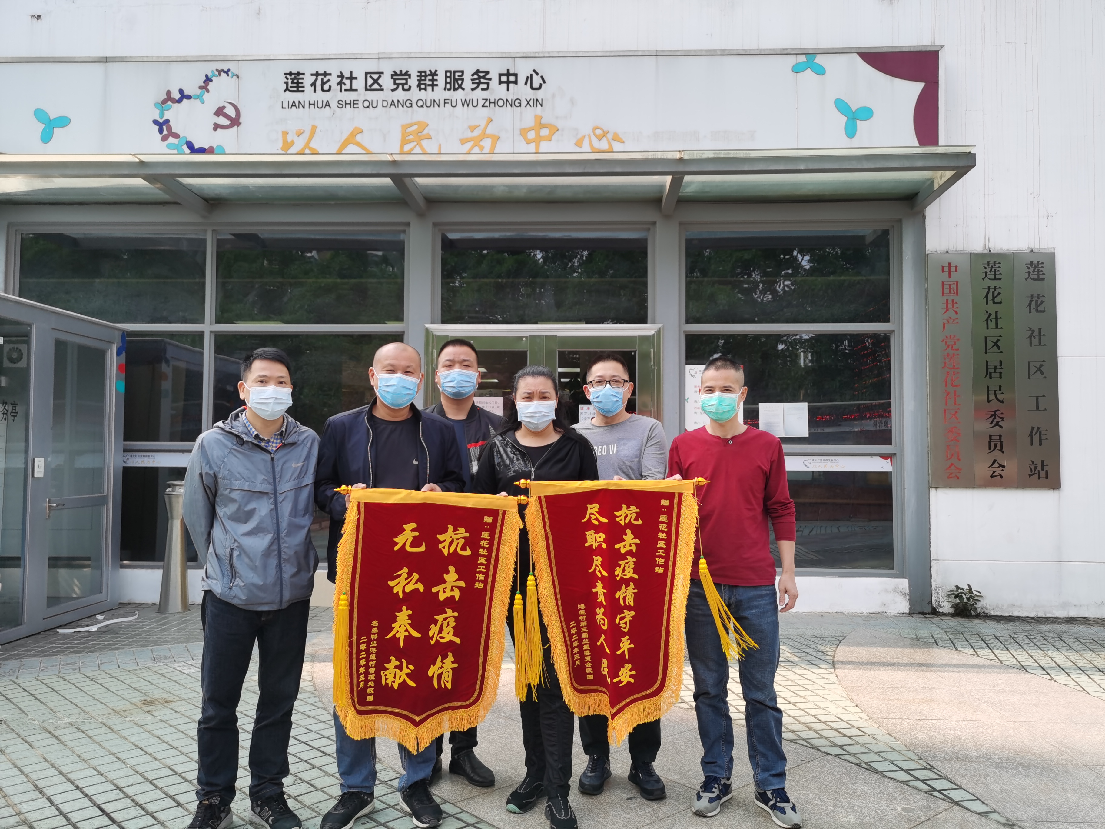 2020年4月10日上午,莲花社区工作站收到港莲村业主委员会代表送来的写着“抗击疫情守平安 尽职尽责为人民”的锦旗和港莲村物业管理处代表送来的写着“抗击疫情 无私奉献”的锦旗,感谢社区工作人员在疫情防控期间尽心尽责守护港莲村居民的平安与健康,并让忙碌的“战斗”的社区工作人员感受到无尽的温暖。