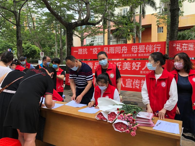 为弘扬中华民族的传统美德,在全社会树立“歌颂母爱,弘扬美德”的良好风尚。2020年5月9日下午,莲花社区党委组织工作人员,在名骏豪庭平方超市门口开展以“一路抗‘疫’风雨同舟 母爱伴行”为主题的母亲节主题宣传活动,党代表冉百涛参与此次活动。