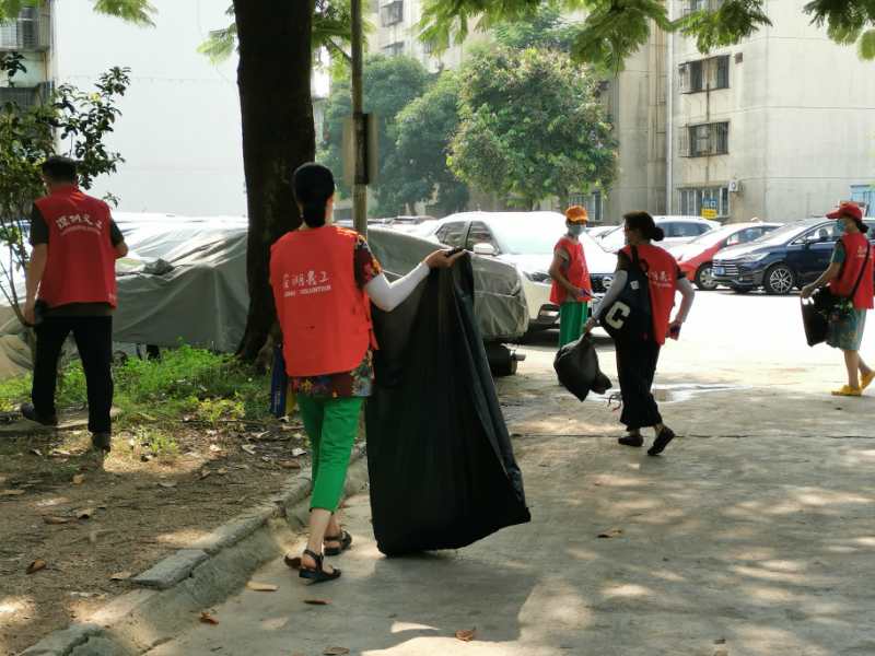 在港莲一村、港莲二村社区志愿服务活动现场,义工们手持扫帚、垃圾袋等工具,捡拾小区道路和草坪上的垃圾,同时,义工们把路边停放的自行车摆放整齐、对堆物等侵占消防通道的安全隐患进行了清理,确保了楼道内公共通道畅通,给居民营造舒适安全的居住环境。
