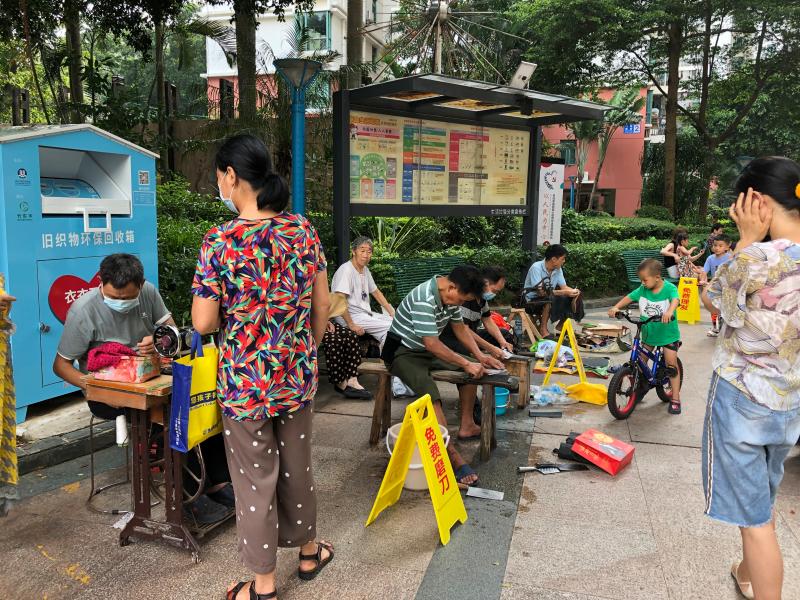 便民活动内容包含免费补鞋、磨刀、补衣服、禁毒宣传、创造文明城市、扫黑除恶、垃圾分类等活动。为居民切身利益办实事。凉爽的天气下,有的展位还排起了长长的队伍,居民络绎不绝,满脸欢喜。