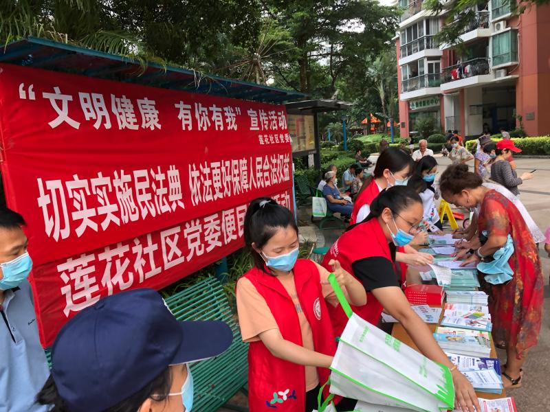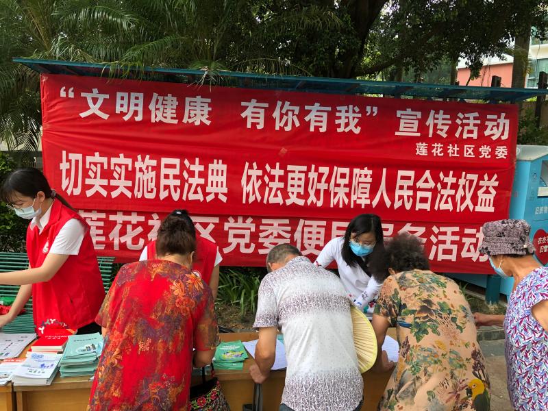 2020年8月31日下午莲花社区党委在名骏豪庭广场开展创文及便民活动。
