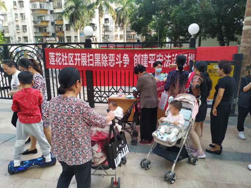 为让辖区居民对黑恶势力犯罪有了更全面的认识,进一步增强居民的法治意识和防范能力,2021年4月13日下午,莲花社区在名骏豪庭开展以“加强扫黑除恶斗争,创建平安法制深圳”为主题的宣传活动。