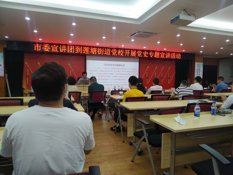 为加强党的全面领导,全力推动党史学习教育往深里走、实里走,努力把学习成效转化为工作实效,提升党员干部的思想格局,2021年5月14日上午,莲花社区参加莲塘街道党校党史专题宣讲活动