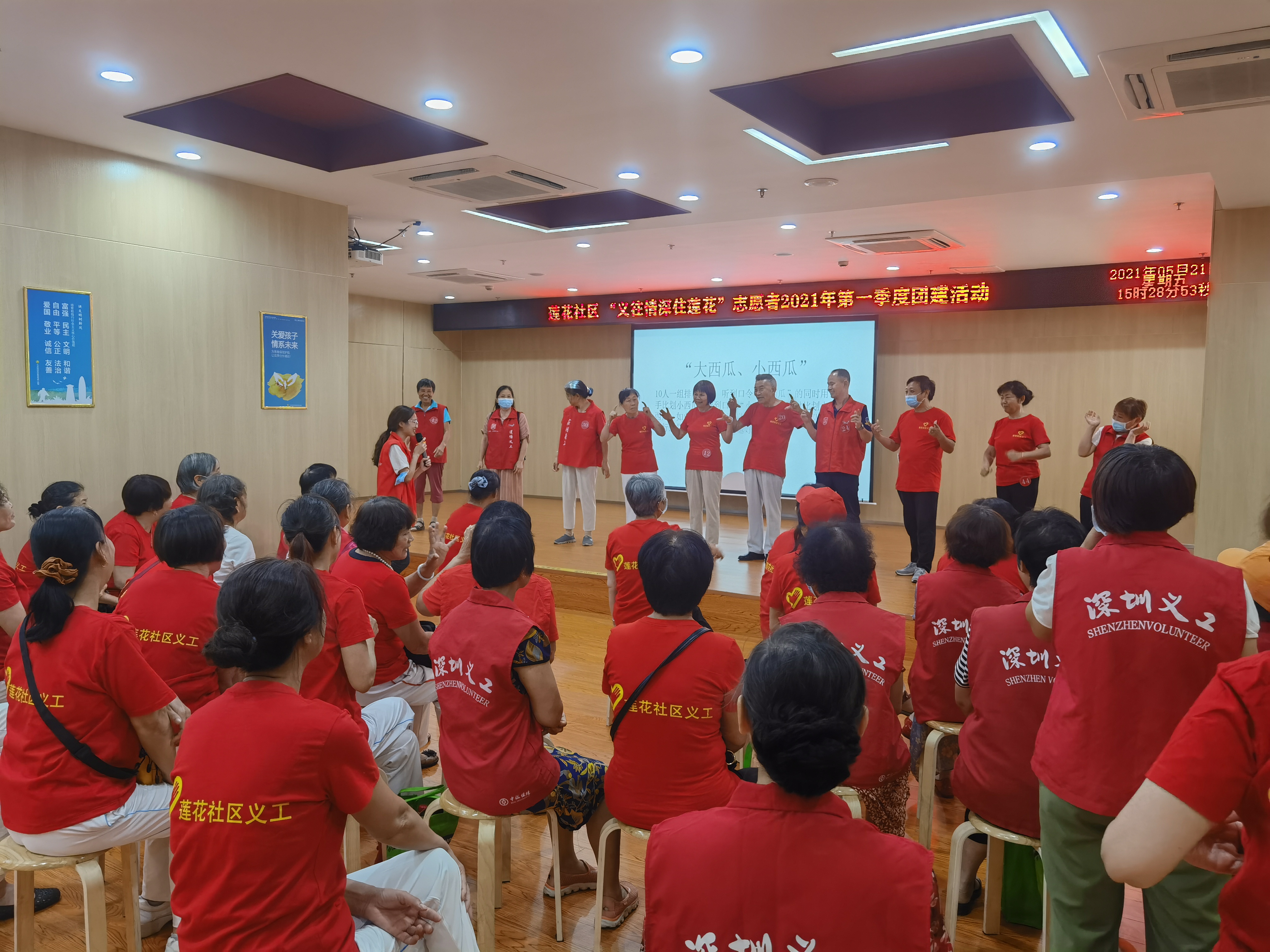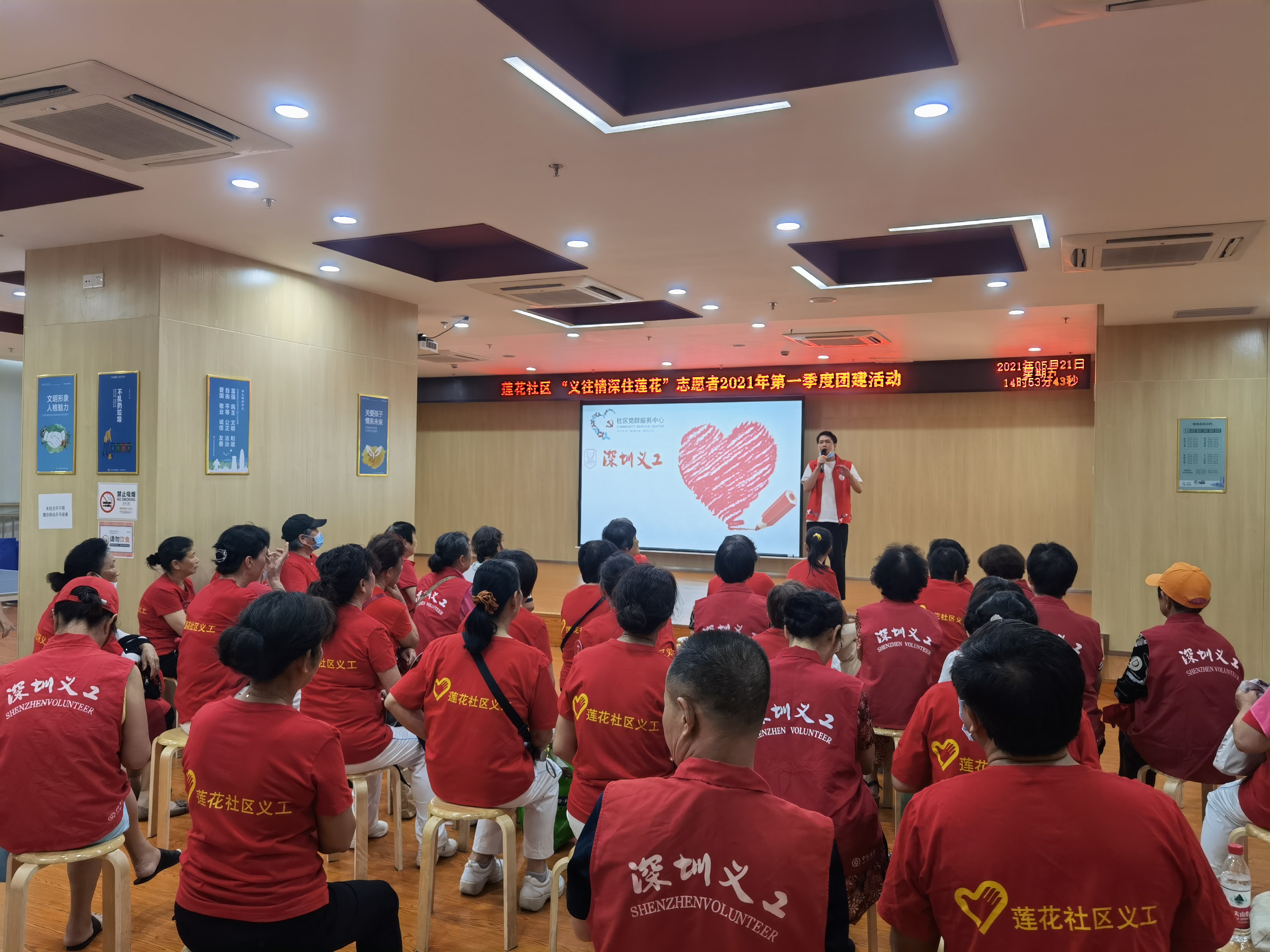 在罗湖区莲塘街道莲花社区,有一抹“红色”始终在忙碌着,每天都能在社区看到他们的身影,开展了形式多样的志愿服务活动,他们是义工,是志愿者,是每一位献出爱心、服务社区的当代活雷锋。为了增进义工间的互动交流,增强义工队伍凝聚力,2021年5月21日下午,莲花社区党群服务中心社工团队组织50名社区义工在莲塘街道综合性文体服务中心开展“义往情深住莲花”志愿者2021年第一季度团建活动。