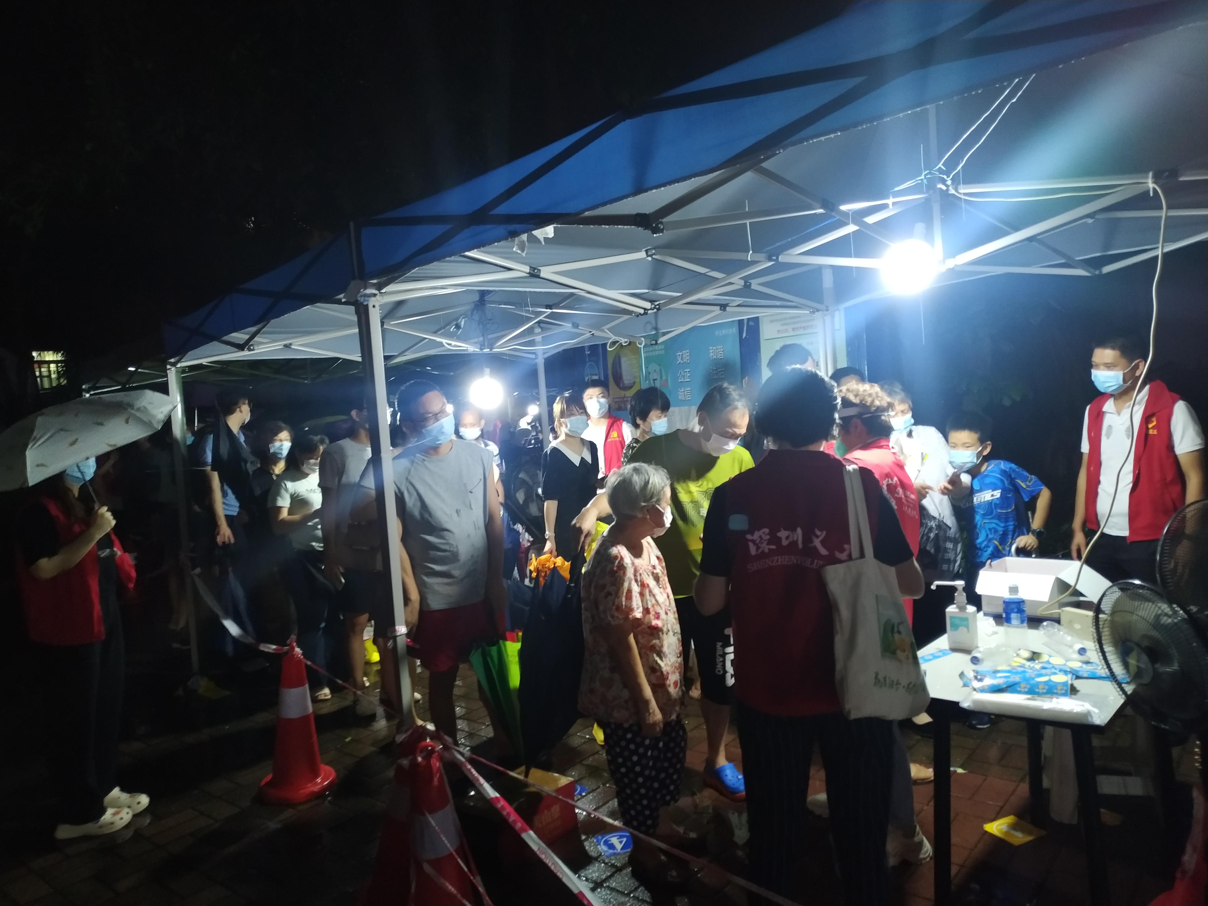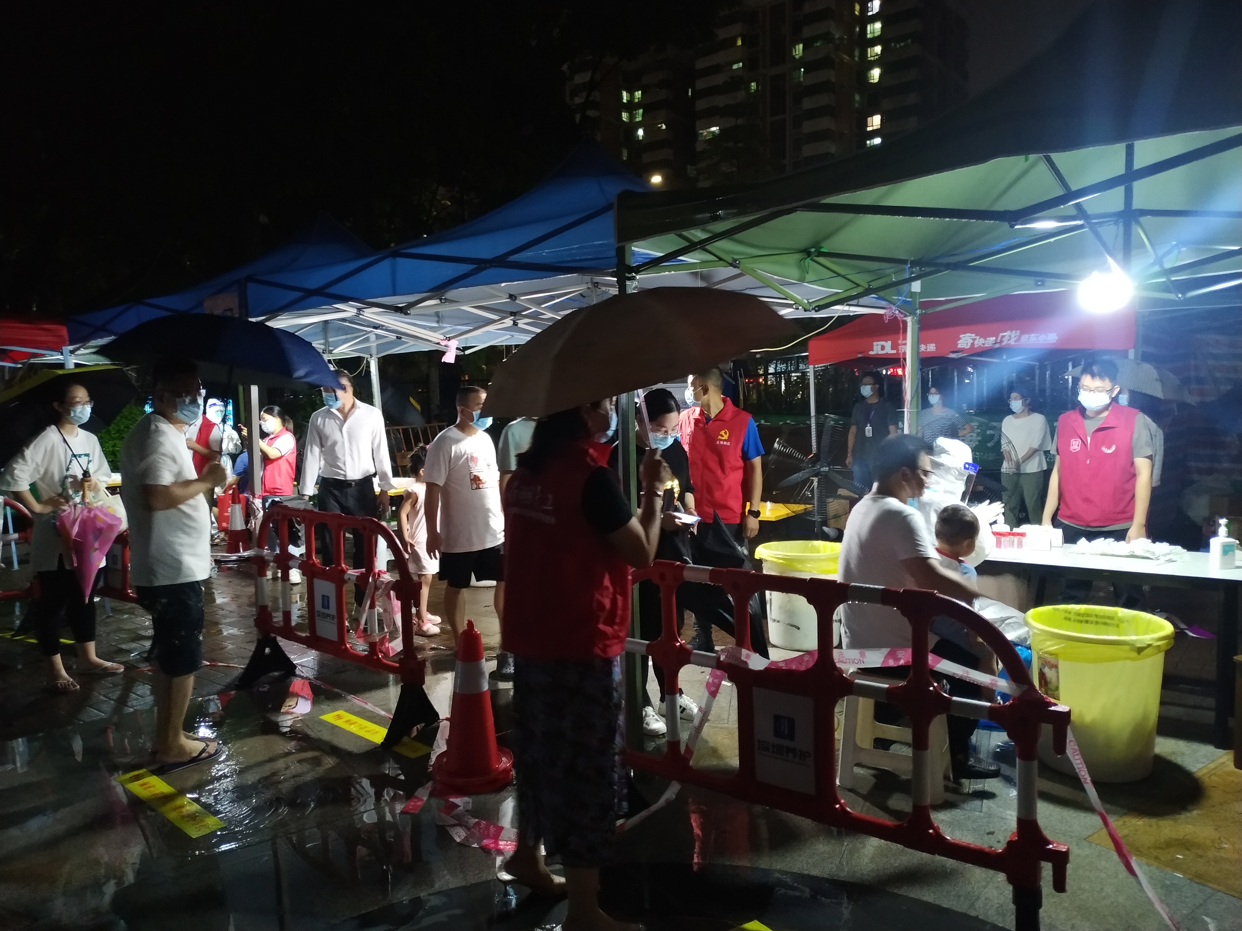 “风驱急雨洒高城,云压轻雷殷地声”。莲花社区桐景花园核酸检测点正下着倾盆大雨,但所有工作人员包括医护人员,社区工作人员,物业管理处,党员志愿者都坚守岗位,核酸检测工作仍然在有条不紊进行,雨水只是沾湿了衣服,但内心服务居民的热情丝毫未减。