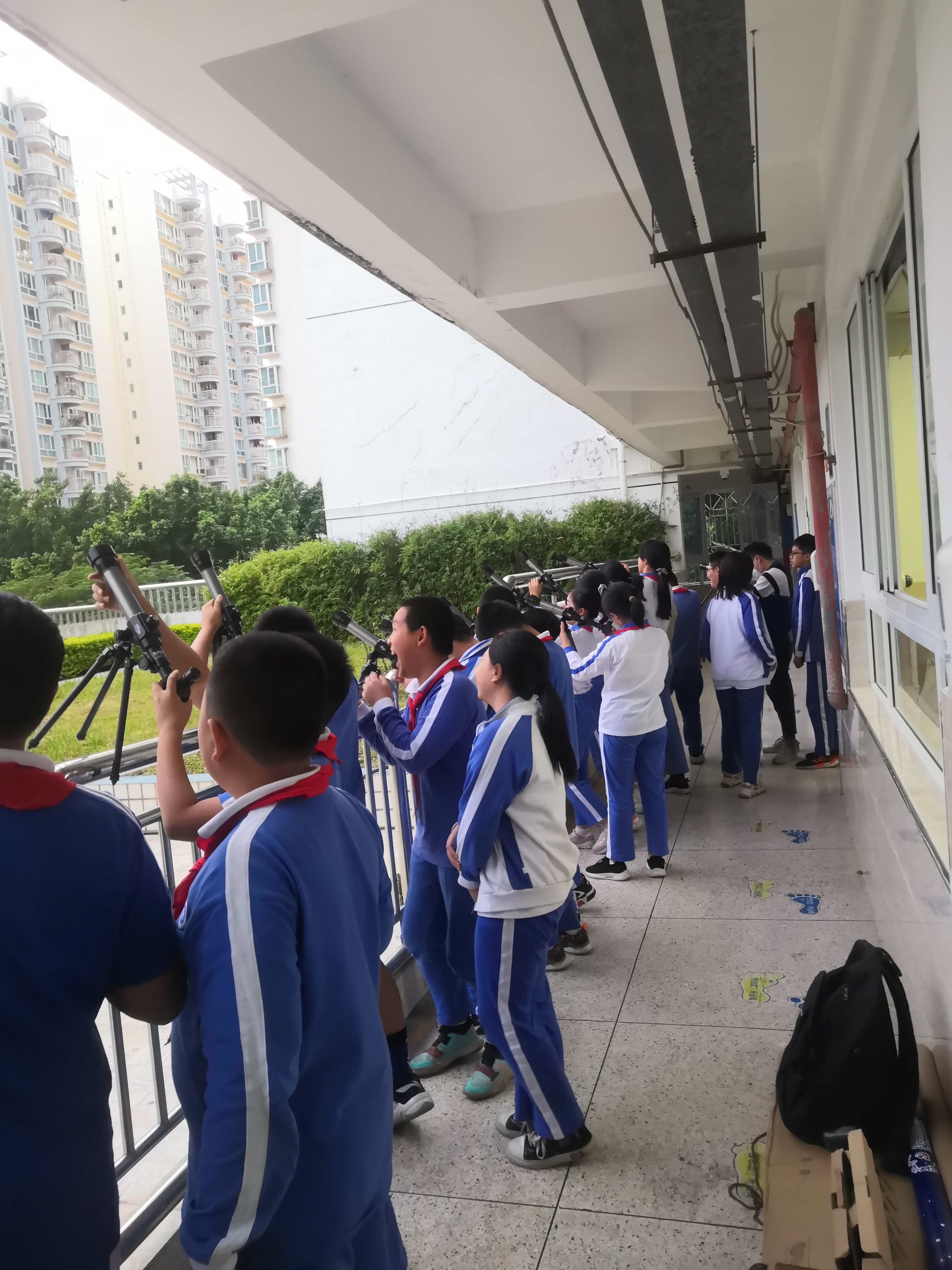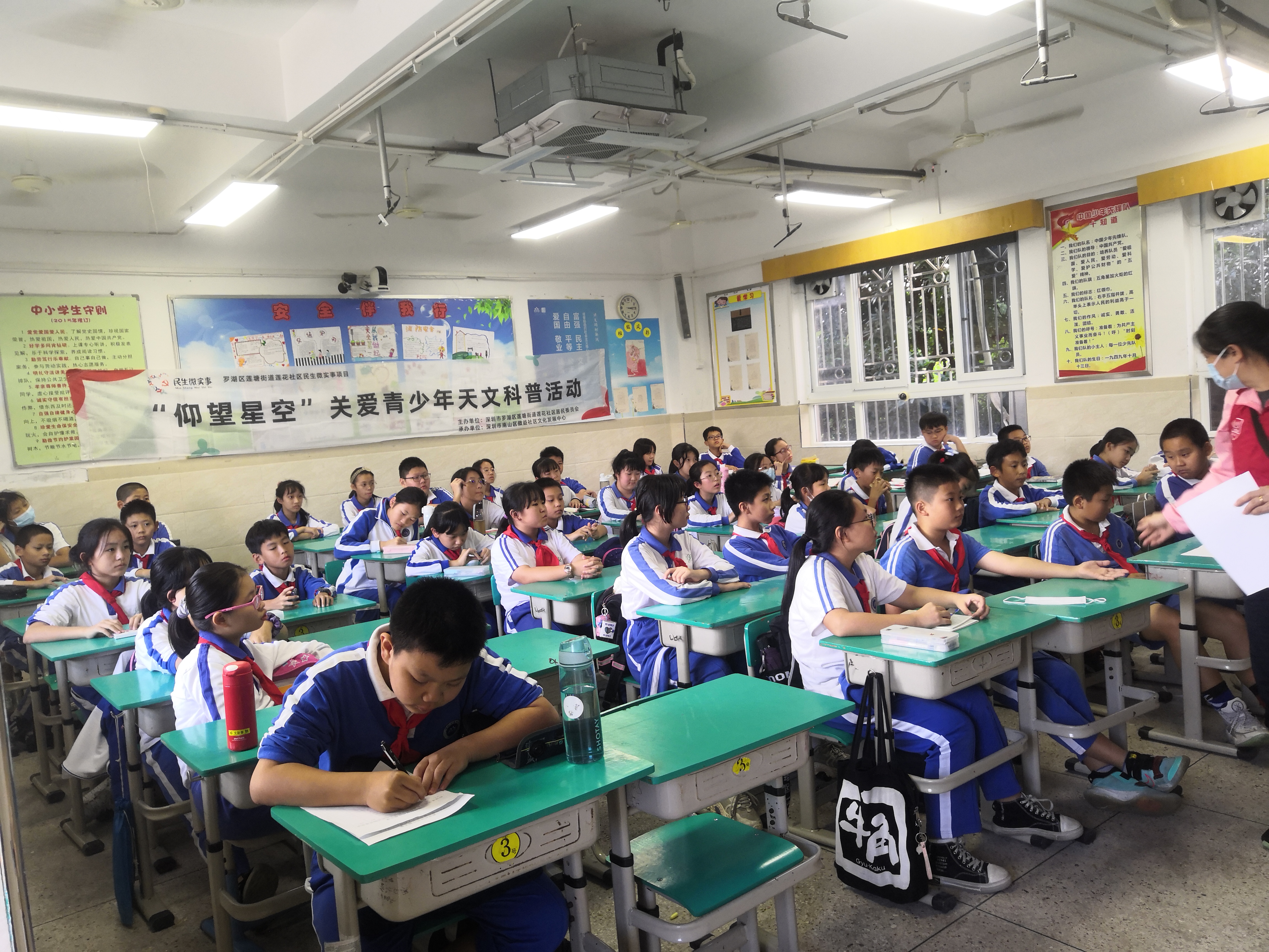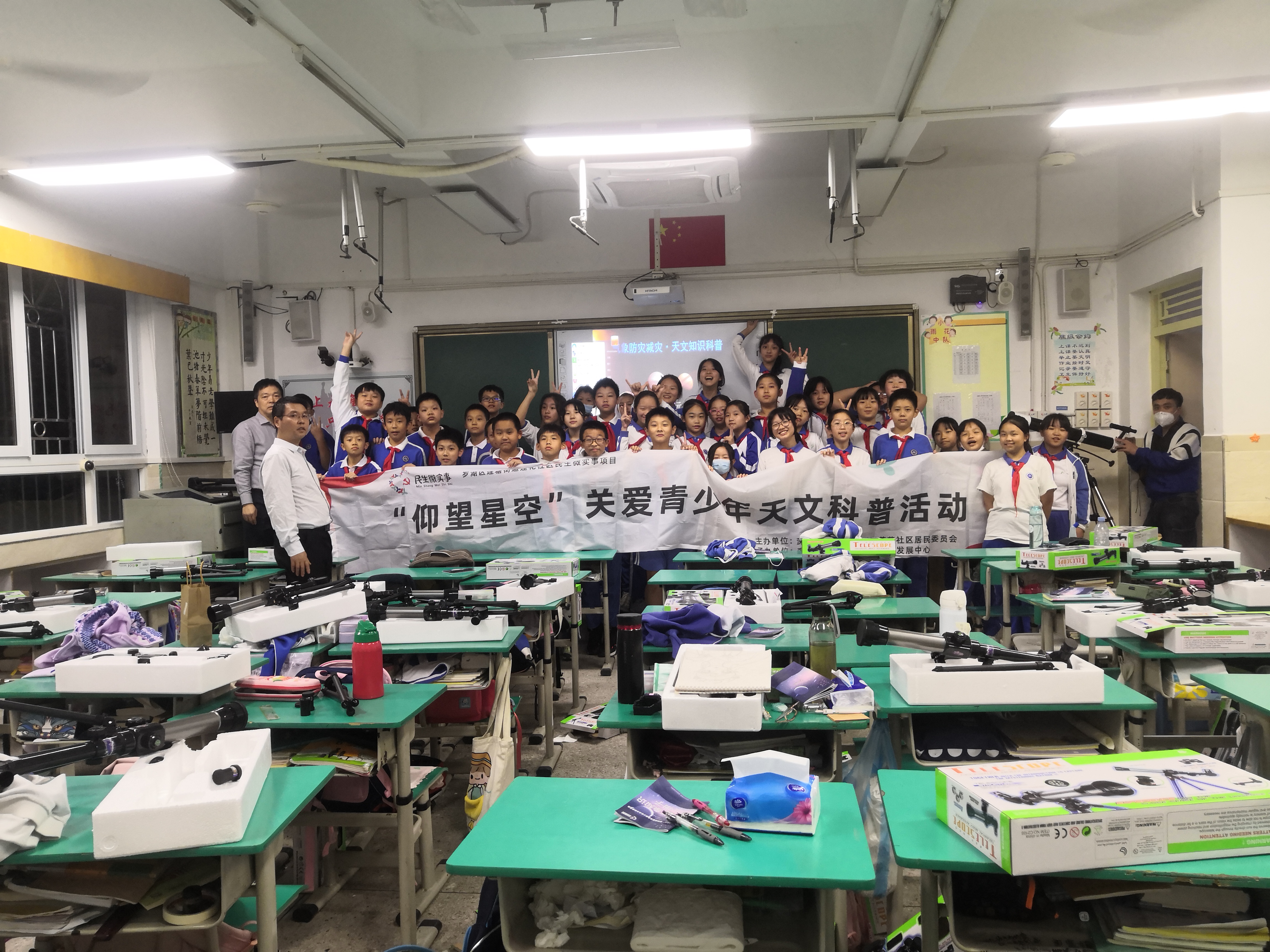 2021年11月12日下午4点30分由莲花社区党委,莲花社区居委会举办的“仰望星空”关爱青少年天文科普第二场活动在罗湖区莲南小学六二班举行,同学们热情扬溢,求知若渴。老师在天文望远镜的辅助下详细讲解了天文望远镜的发展进程。并重点介绍了我国坐落在贵州省黔南布依族苗族自治州平塘县克度镇大窝凼的喀斯特洼坑中有“天眼”之称的500米口径球面射电望远镜。