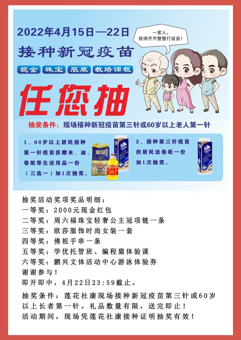 加强新冠疫情防控,需要您的“一臂之力”。“打疫苗,护健康,抽好礼”活动时间2022年4月15日至2022年4月22日,礼品数量有限,送完即止哦!还未接种新冠疫苗加强针的居民和60岁以上的爷爷奶奶,快快来莲花社康接种疫苗吧!