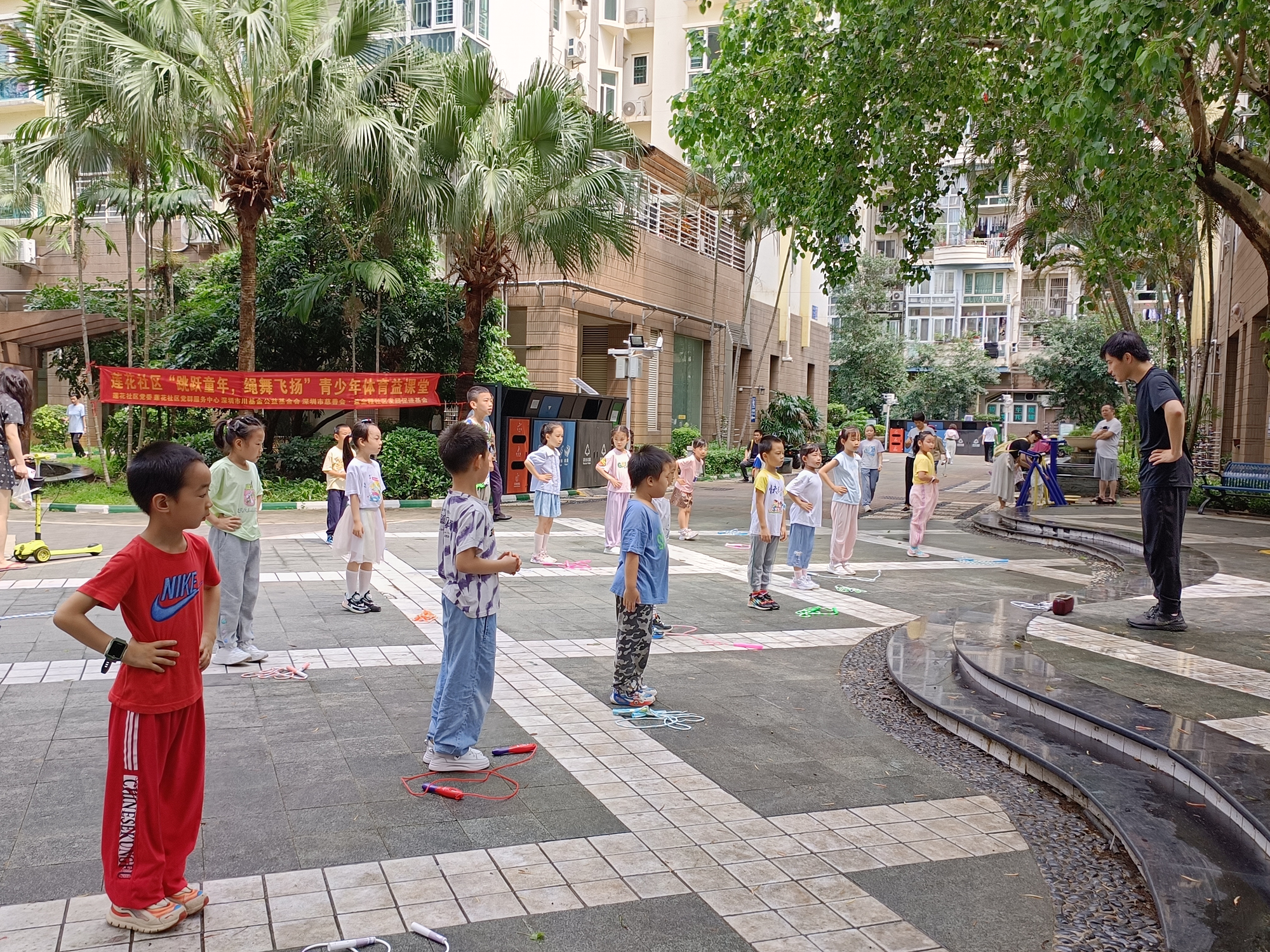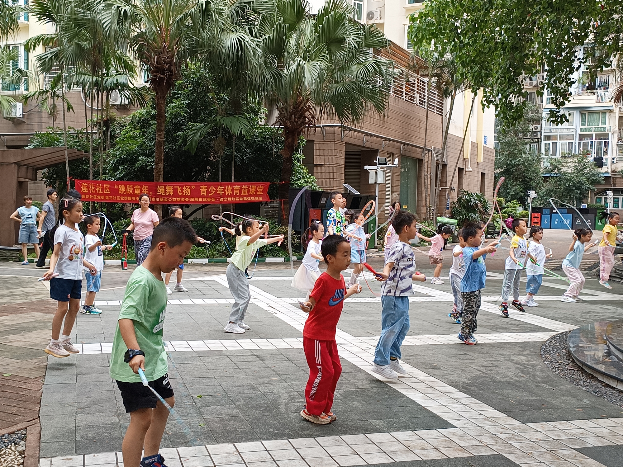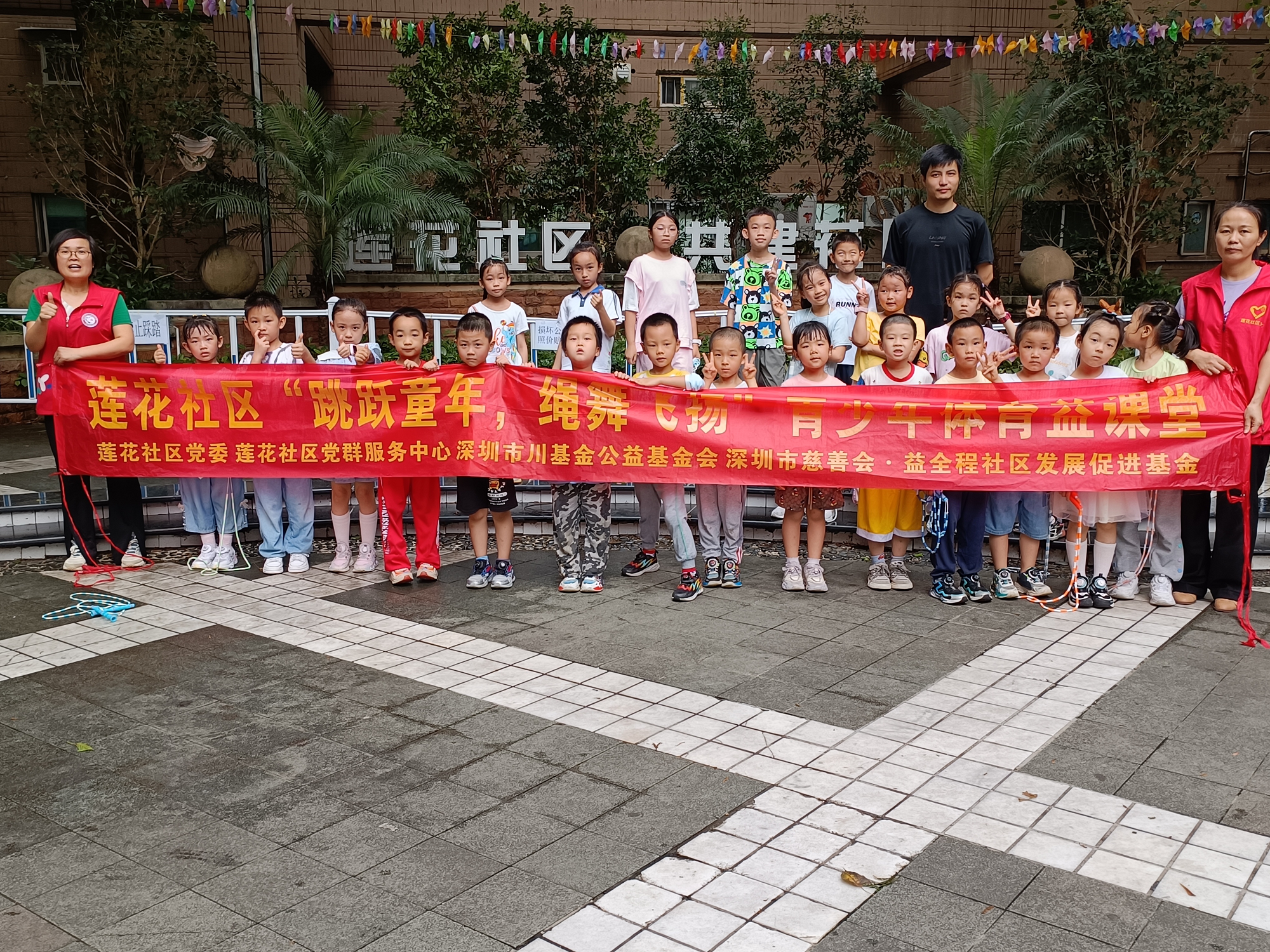 为了倡导健康生活方式,培养社区儿童青少年对体育运动的热爱,促进他们身心的全面发展,在莲花社区党委的支持下,莲花社区党群服务中心携手深圳市慈善会·益全程社区发展促进基金,于2024年4月27日上午隆重举办了“跳跃童年,绳舞飞扬”青少年体育益课堂第六节课程。