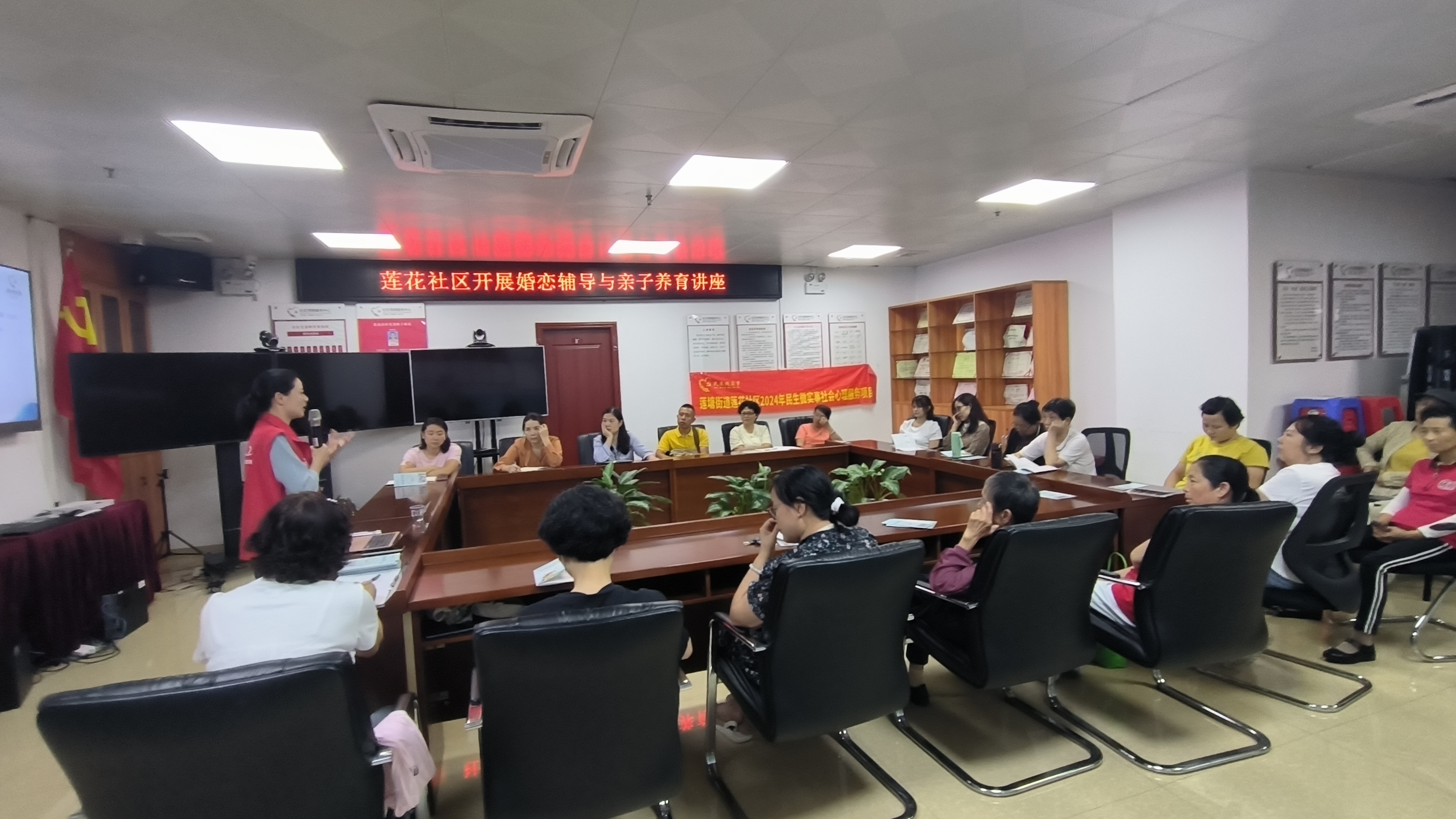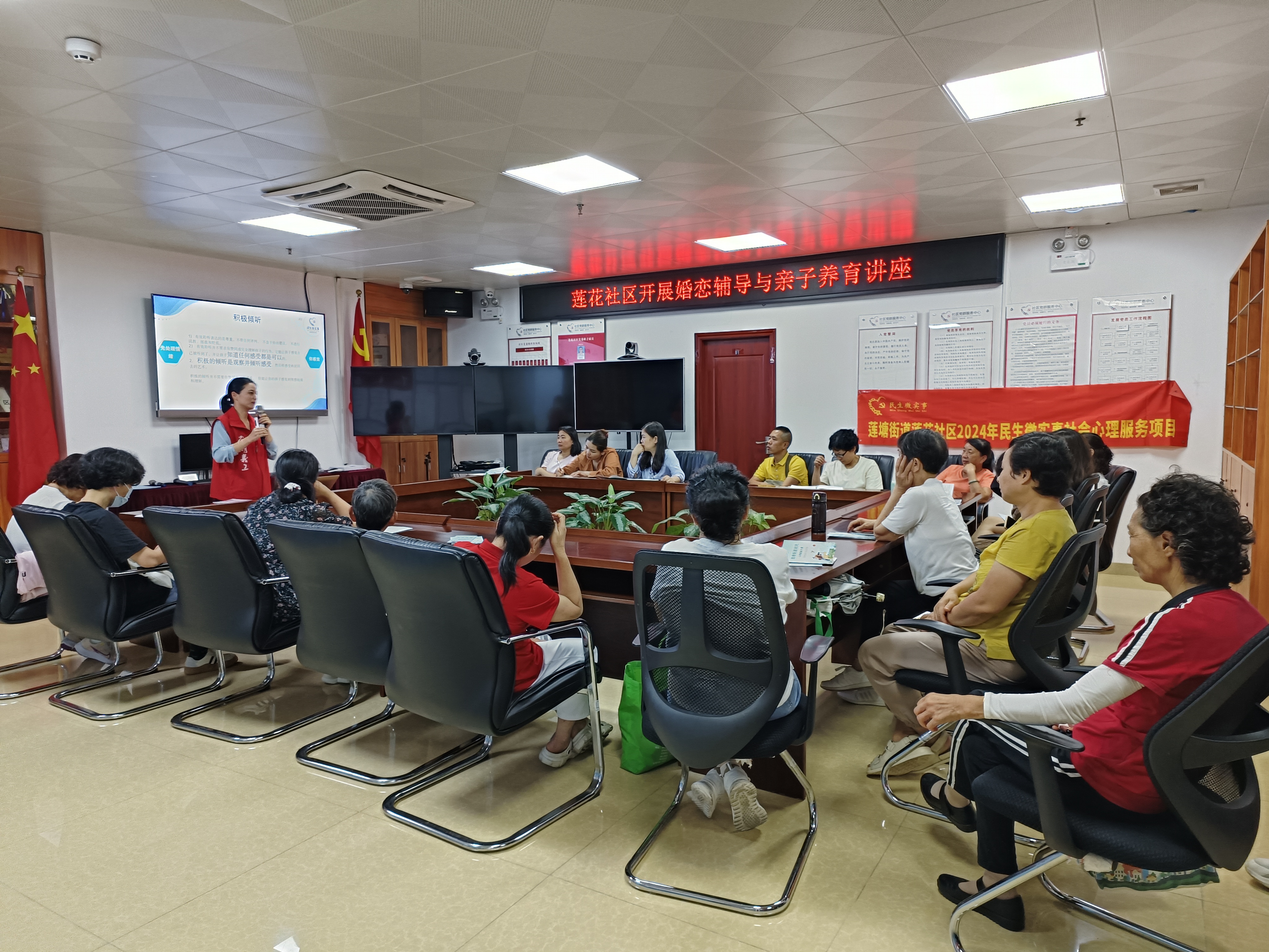 为普及科学正确的教育观念,提升社区居民获得幸福感的能力,在莲花社区党委的大力支持下,莲花社区党群服务中心社工团队携手莲塘街道社会心理服务站,于2024年5月21日下午在莲花社区党群服务中心活动室开展了莲花社区“让爱留在家里”婚恋辅导与亲子教育心理科普活动,本次讲座共吸引到社区19名居民参与。