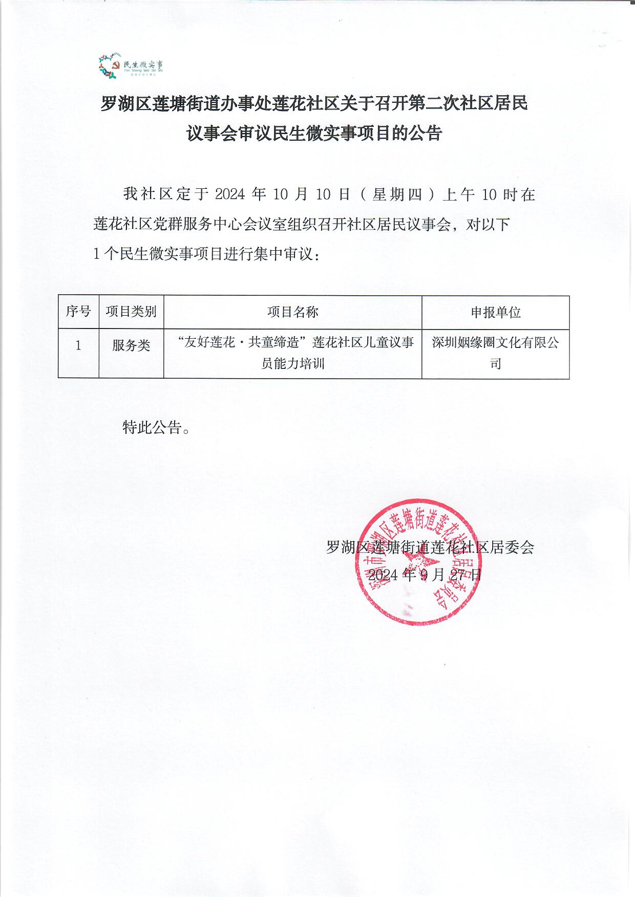 莲塘街道莲花社区关于召开第二次社区居民议事会审议民生微实事项目公告
