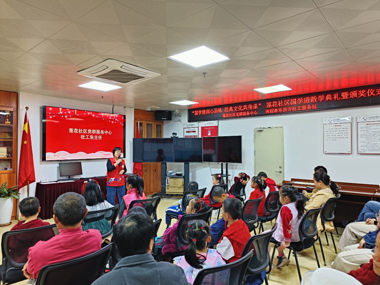 紧接着,莲花社区党群服务中心社工主任朱志才与至善国学中心理事李先智老师相继发表致辞。东西方朱社工首先对至善国学中心的支持表达了诚挚的谢意,并寄语孩子们在《弟子规》的引领下,持续保持对知识的热忱,以经典为伴,智慧为灯,勇攀知识高峰,为成为社会的有用之才不懈奋斗。李老师则强调,结业不是终点,而是新旅程的开始,他勉励孩子们在日后的学习生活中积极践行“仁、义、礼、智、信”,实现知行合一,同时呼吁更多家庭加入国学学习的行列,共同促进家庭和谐、社会和谐。