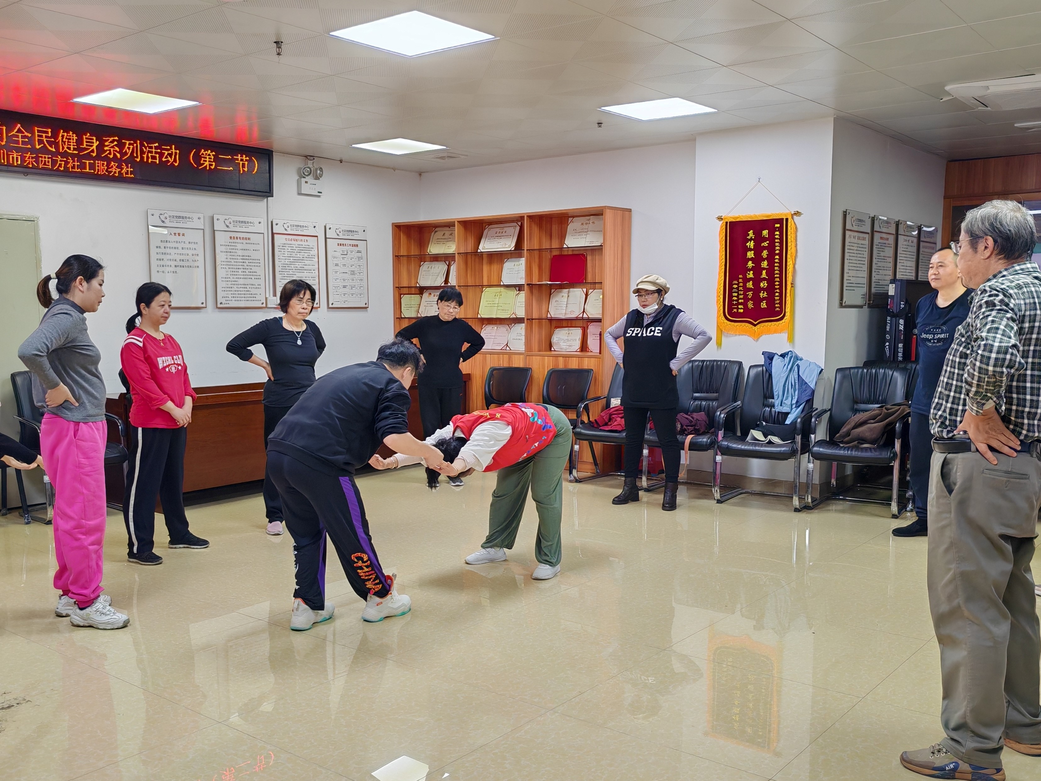 活动现场氛围热烈而井然有序。东西方社工杨社工担任本次活动的指导老师,为居民们带来了精彩的八段锦教学。经过上一期的学习,居民们对八段锦的基本动作已经有所了解。为了进一步规范动作,提升练习效果,杨社工再次对八段锦的每段、每节的锻炼重点进行了细致的指导示范,并逐一纠正了居民们在动作上存在的细微错误和不到位之处。