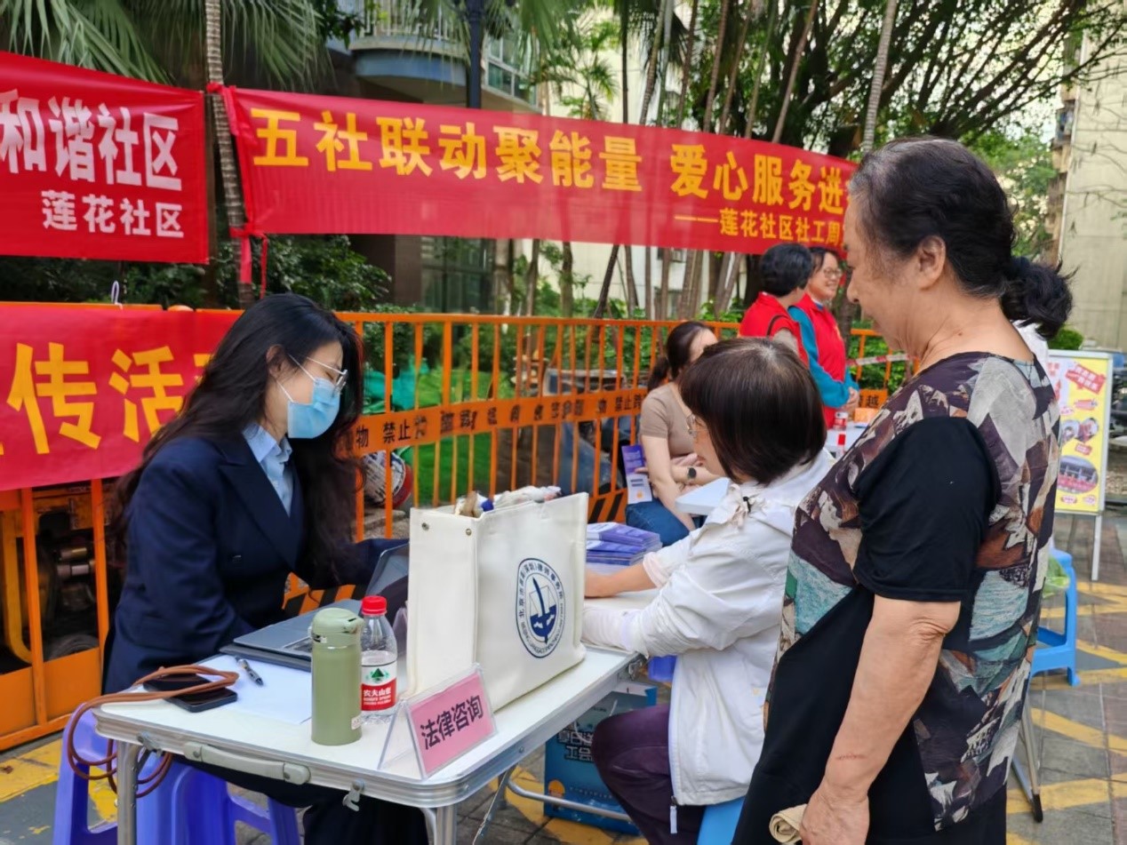为了进一步扩大法治宣传的覆盖面,同日下午,莲花社区在鹏兴五期广场举办了维护消费者权益的宣传活动。活动中,东西方社工巧妙利用展板,以图文并茂的形式向居民展示了消费者权益的涵盖范围以及消费权益受损时的维权方法。同时,驻点律师通过摆台讲解、互动问答等多种宣传方式,向社区居民普及了近年来维护消费权益的热点问题,并展示了十种常见的金融消费风险及其特征与危害。王律师提醒居民时刻保持理性判断,防止因小利而造成重大损失,并特别叮嘱老年人要守好自己的“钱袋子”,警惕未知链接、陌生来电、个人信息泄露以及转账汇款等风险。