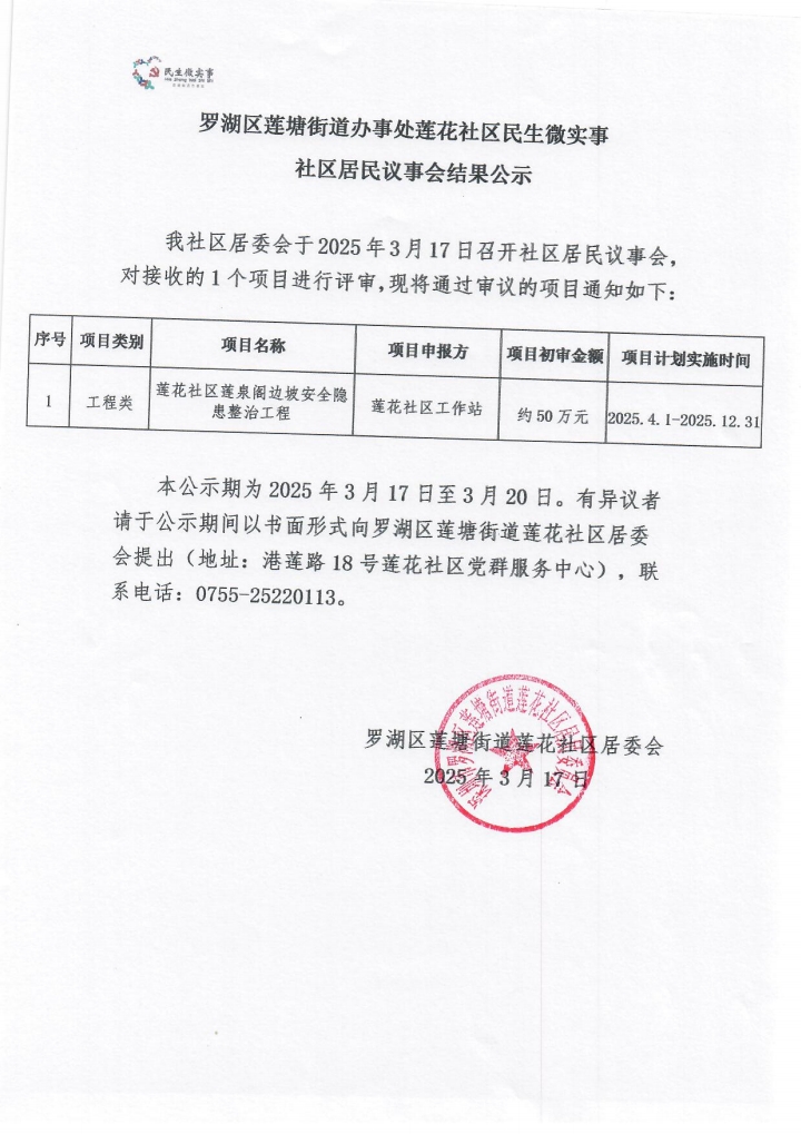 罗湖区莲塘街道办事处莲花社区民生微实事 社区居民议事会结果公示