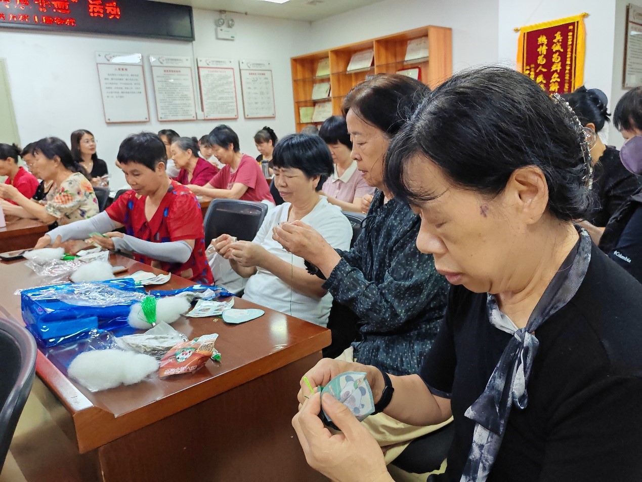 随后,石社工开始现场教学香囊制作方法。从香料的选取与填充,到针线的穿引与收尾,每一个步骤都讲解得细致入微。在社工的指导下,居民们纷纷拿起材料动手制作。