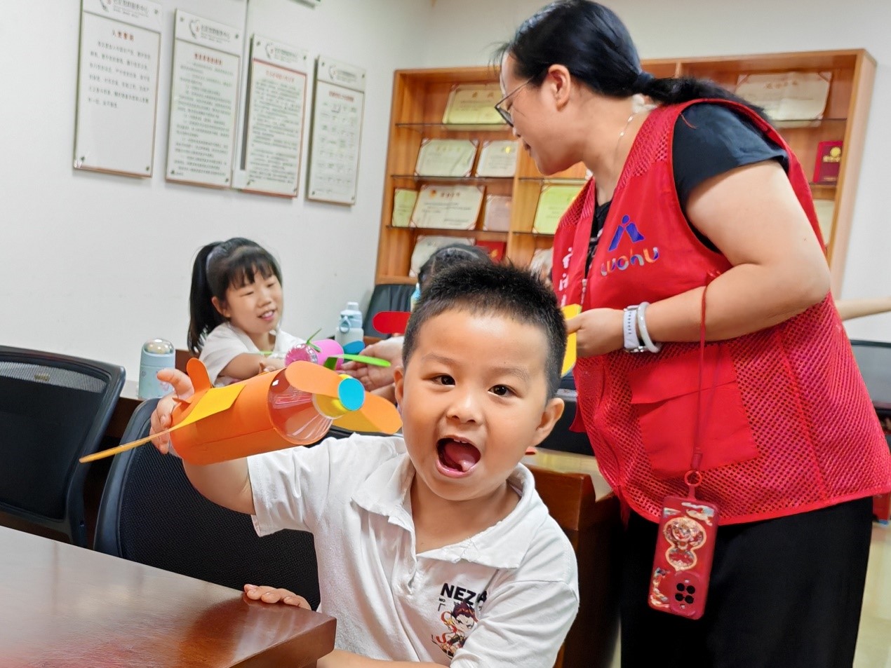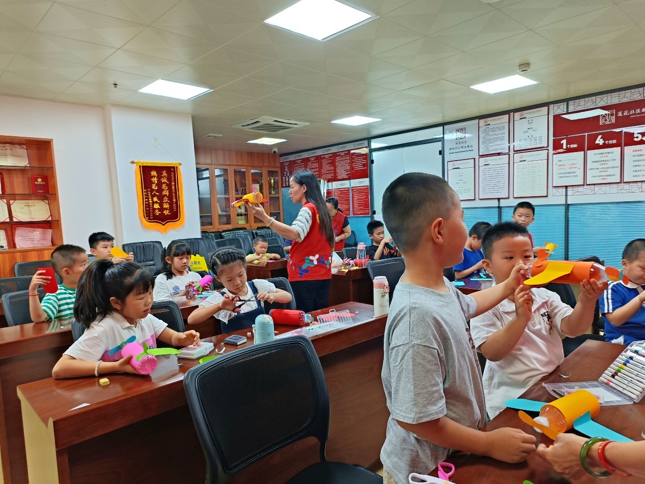 手工制作模型环节是本次活动的一大亮点,更巧妙地将科技与环保理念相融合。孩子们在黄社工的耐心指导下,利用废旧矿泉水瓶,开启了一场创意十足的变废为宝之旅。他们手持剪刀细心裁剪,用胶水认真粘贴,充分发挥自己的想象力和创造力。原本普通的饮料瓶,在孩子们的巧手下,逐渐变成了形态各异的飞机模型。看着自己的作品,孩子们的脸上洋溢着自豪和满足的笑容。王同学兴奋地举起自己的作品,大声说道:“以前饮料瓶随手就扔,没想到还能变成这么酷的飞机模型,以后我可得好好收集这些‘宝贝’了!”