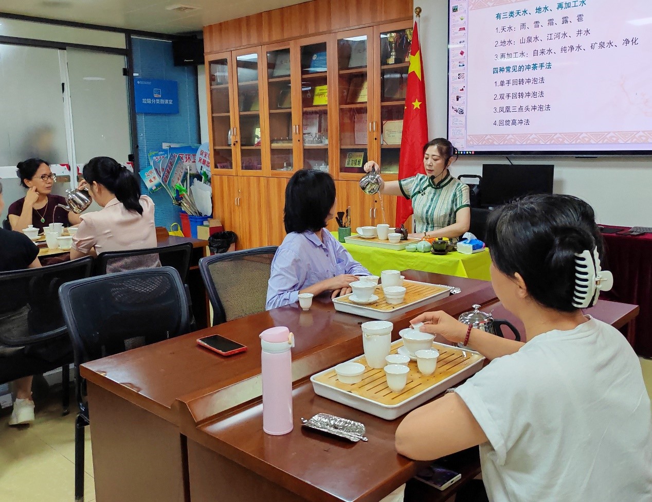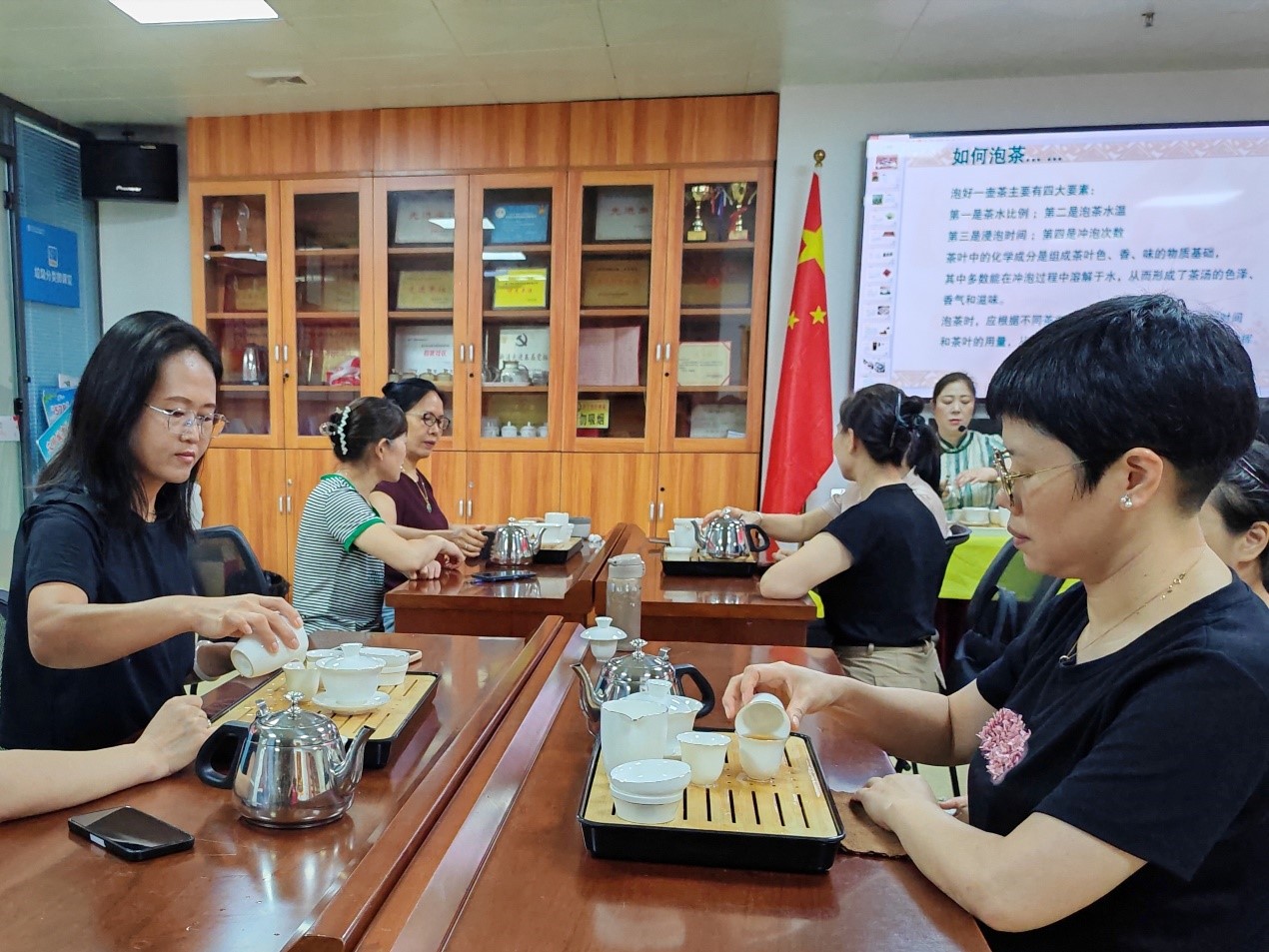 活动开场,茶艺师化身文化传播者,生动讲解茶文化。从“神农尝百草”的传说,到六大茶类的特点;从茶具的演变历程,到茶道礼仪的规范,茶艺师借助图文,引领居民领略千年茶文化的魅力。妈妈们听得入神,眼神中满是好奇与向往。