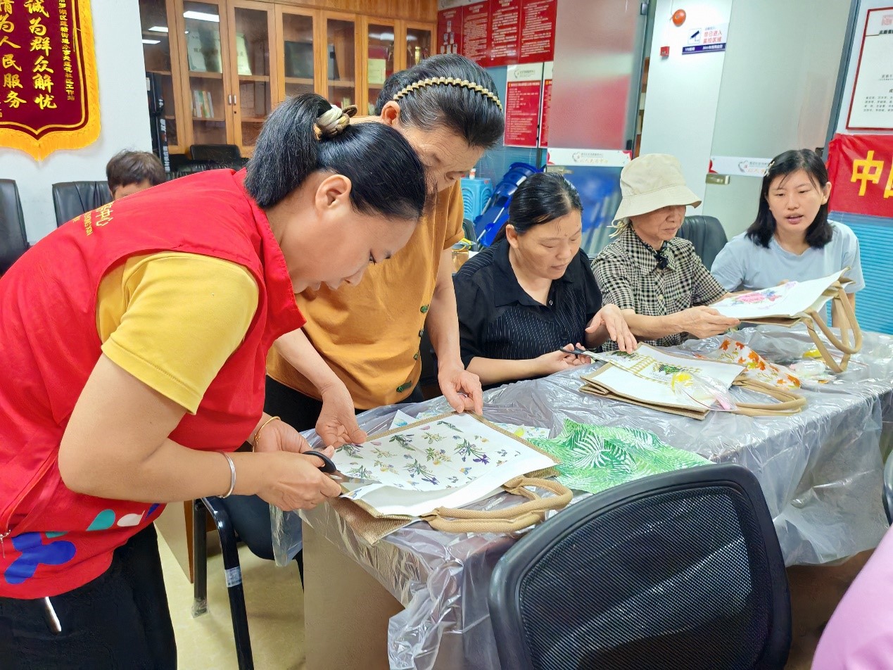 医保政策宣讲结束后,温馨有趣的蝶古巴特手提包制作活动欢乐开启。在杨社工的引导下,居民们纷纷化身创意达人,充分发挥自己的想象力和创造力。她们精心裁剪印花布料,通过拼贴、刷胶等步骤,将一块块普通的布料变成了一个个独具特色的蝶古巴特手提包。制作过程中,大家相互帮助、交流经验,欢声笑语回荡在活动现场。不一会儿,一个个承载着创意与心意的蝶古巴特手提包便呈现在大家眼前,成了活动现场一道亮丽的风景线。