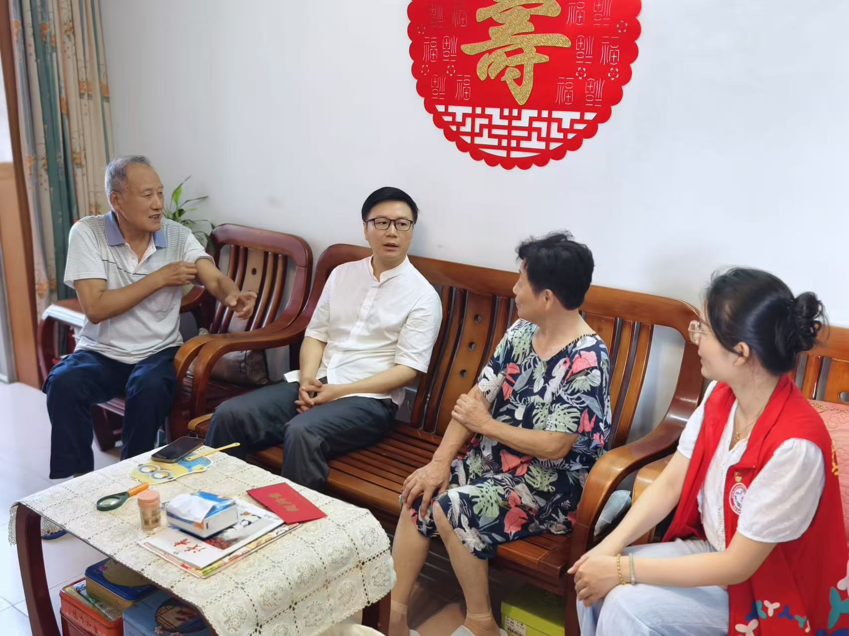 首先,莲花社区第一书记陶洁带队来到港莲二村朱叔家中。陶洁书记关切地询问朱叔身体情况,向朱叔至于节日的问候,亲手为朱叔佩戴“光荣在党50年”纪念章。在朱叔家中,陶洁书记详细询问了朱叔夫妻俩身体状况和生活需求。据了解,朱叔与其妻子李姨均是二十岁左右就早已入党,当时积极响应党和国家的号召,成为第一批来深建设者,进入深圳保安集团,参与开发和建设深圳的“拓荒”工作。陶节书记认真聆听他们入党的初心,和奋斗历史,退休后他们仍积极参与社区建设和志愿服务,继续发挥余热。陶书记强调,社区党委要持续做好老党员服务保障工作,主动解决他们的实际困难,同时号召全体党员以老一辈同志为标杆,传承红色基因,凝聚奋进力量。