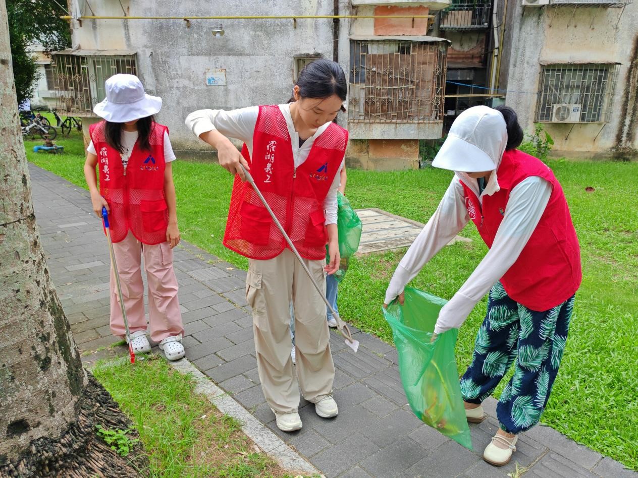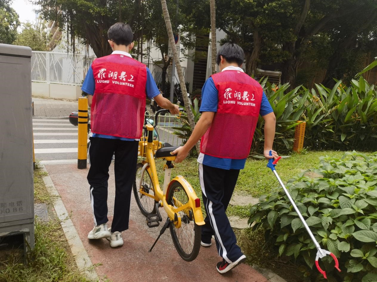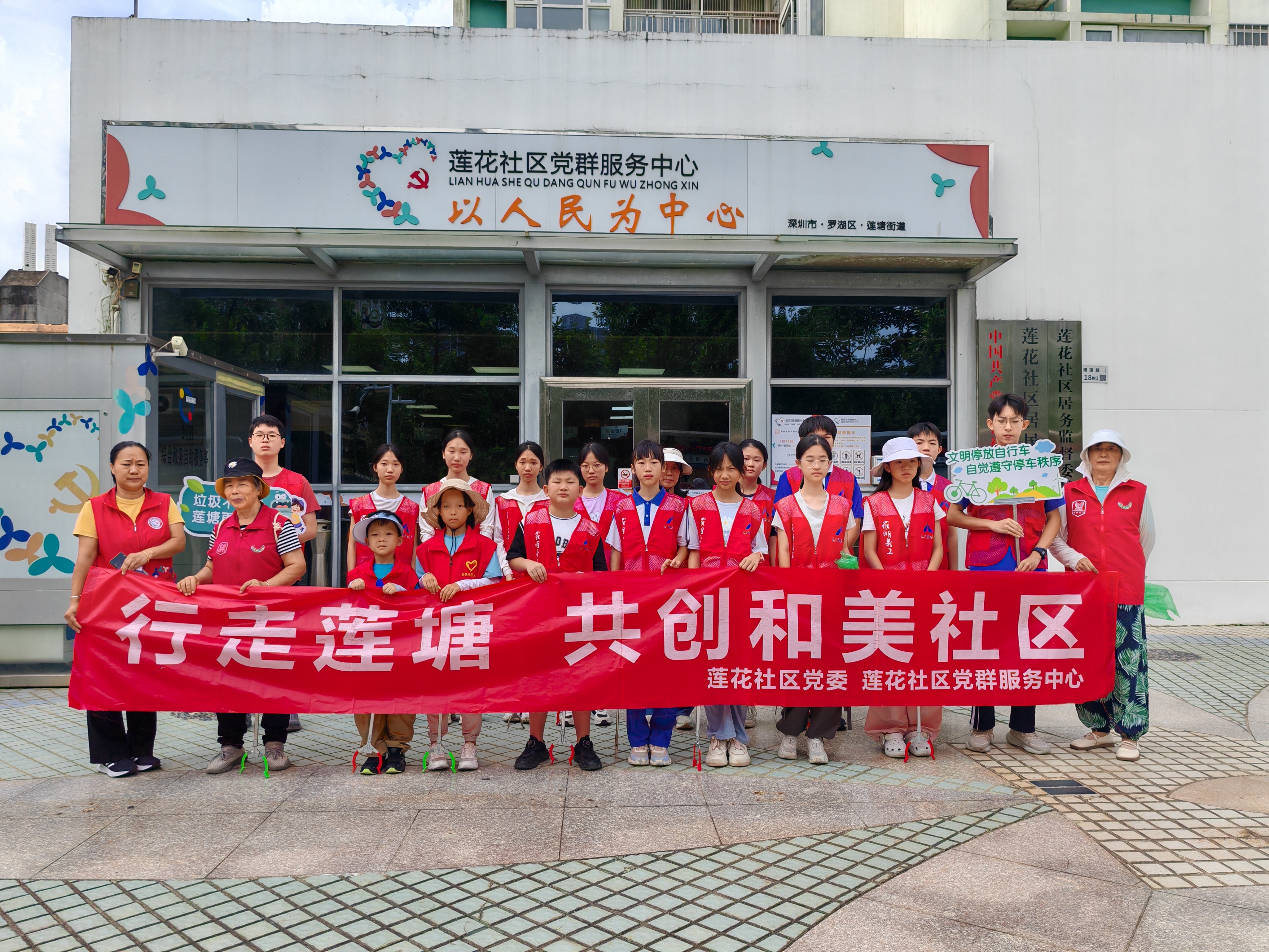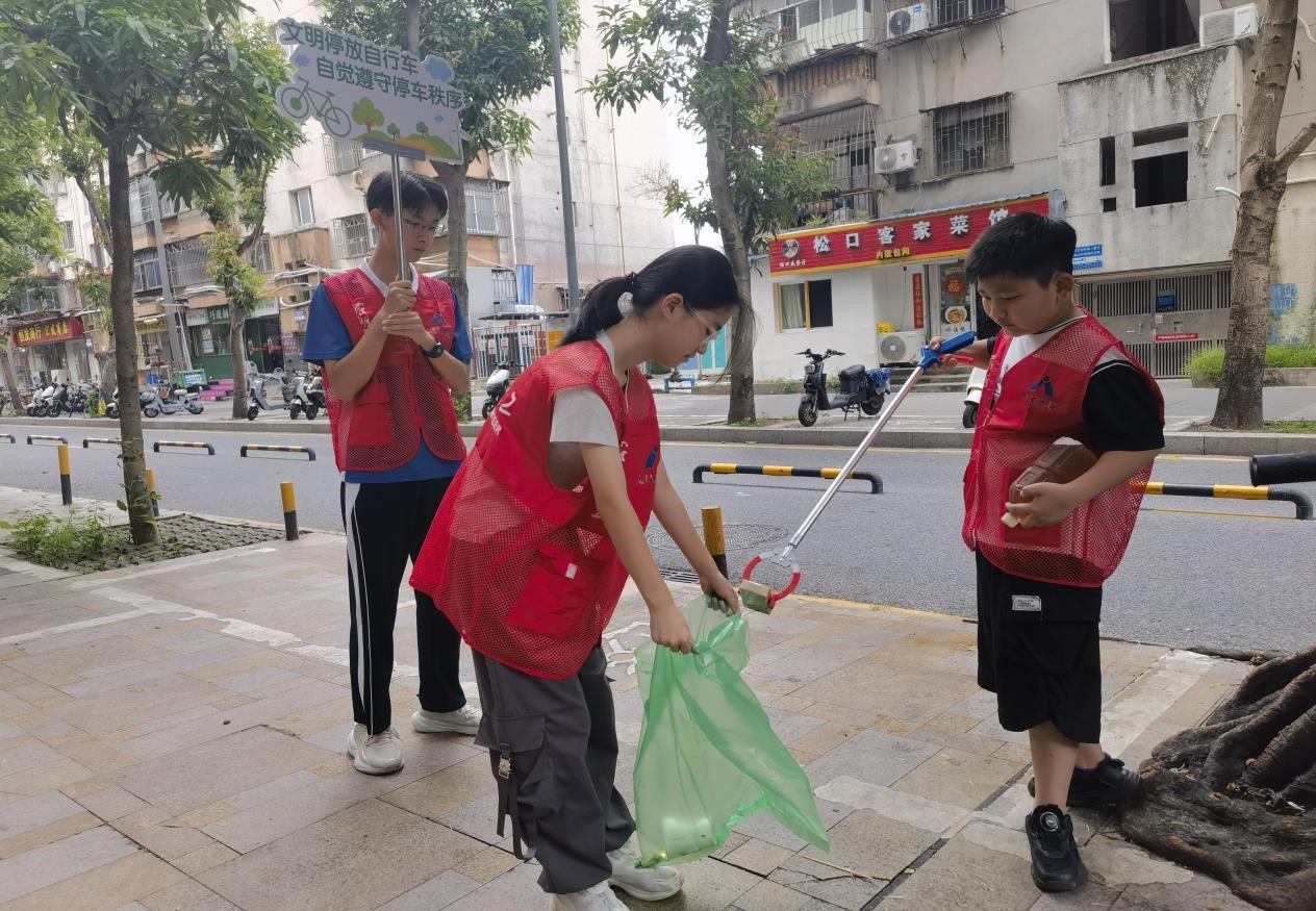 志愿服务现场,身着红马甲的青少年志愿者手持清洁工具和宣传牌,不仅以"地毯式"排查的方式,细致清理绿化带缝隙中的烟头、纸屑,规范共享单车停放秩序,还积极向居民宣传"垃圾不落地 莲塘更美丽"、"文明停放自行车"等环保理念,以实际行动倡导文明生活方式。