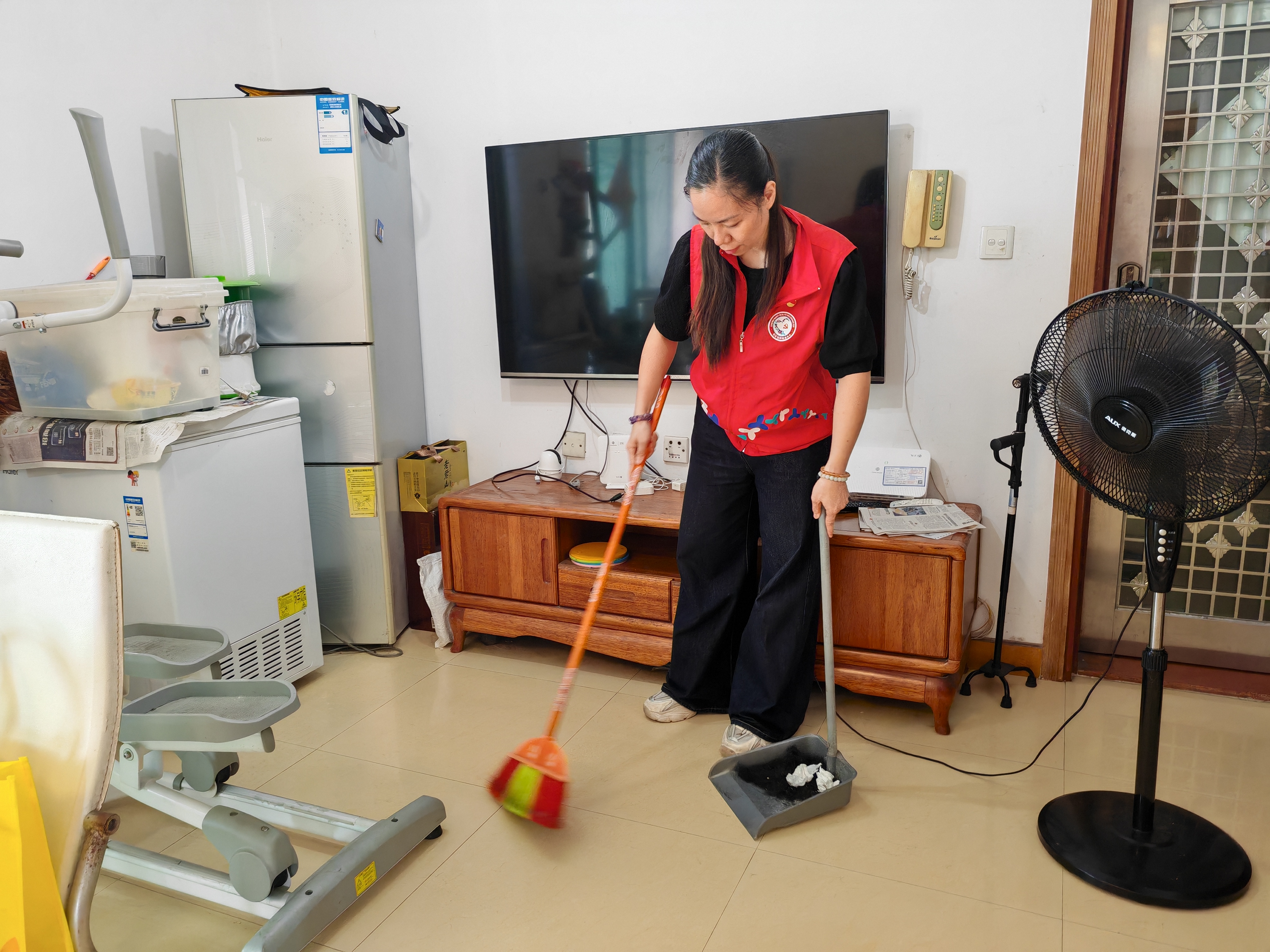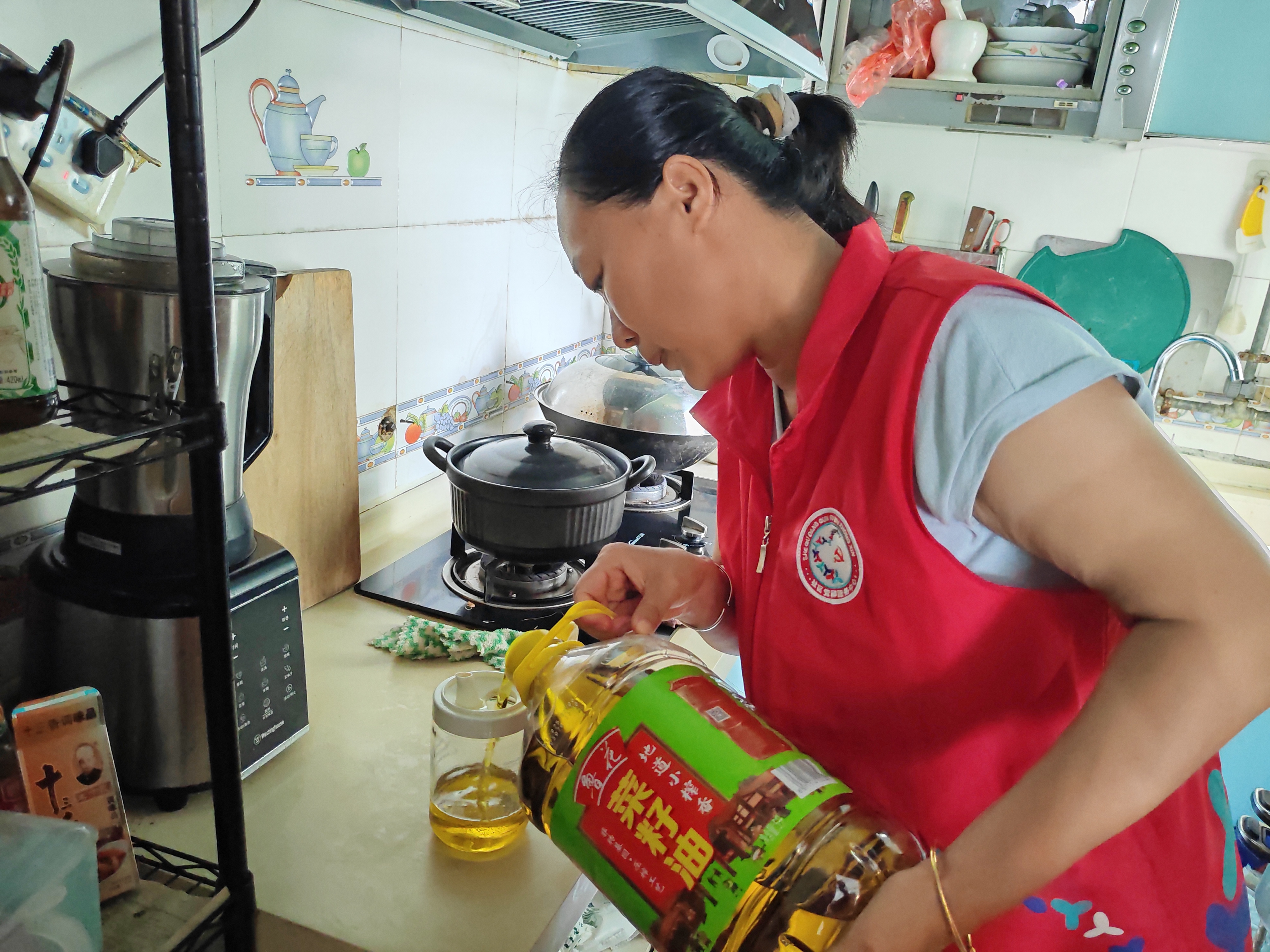 随后社工清理了地板上的碎发,收拾得干干净净。得知阿姨倒不了油,又帮忙把大桶的油倒到小壶里。