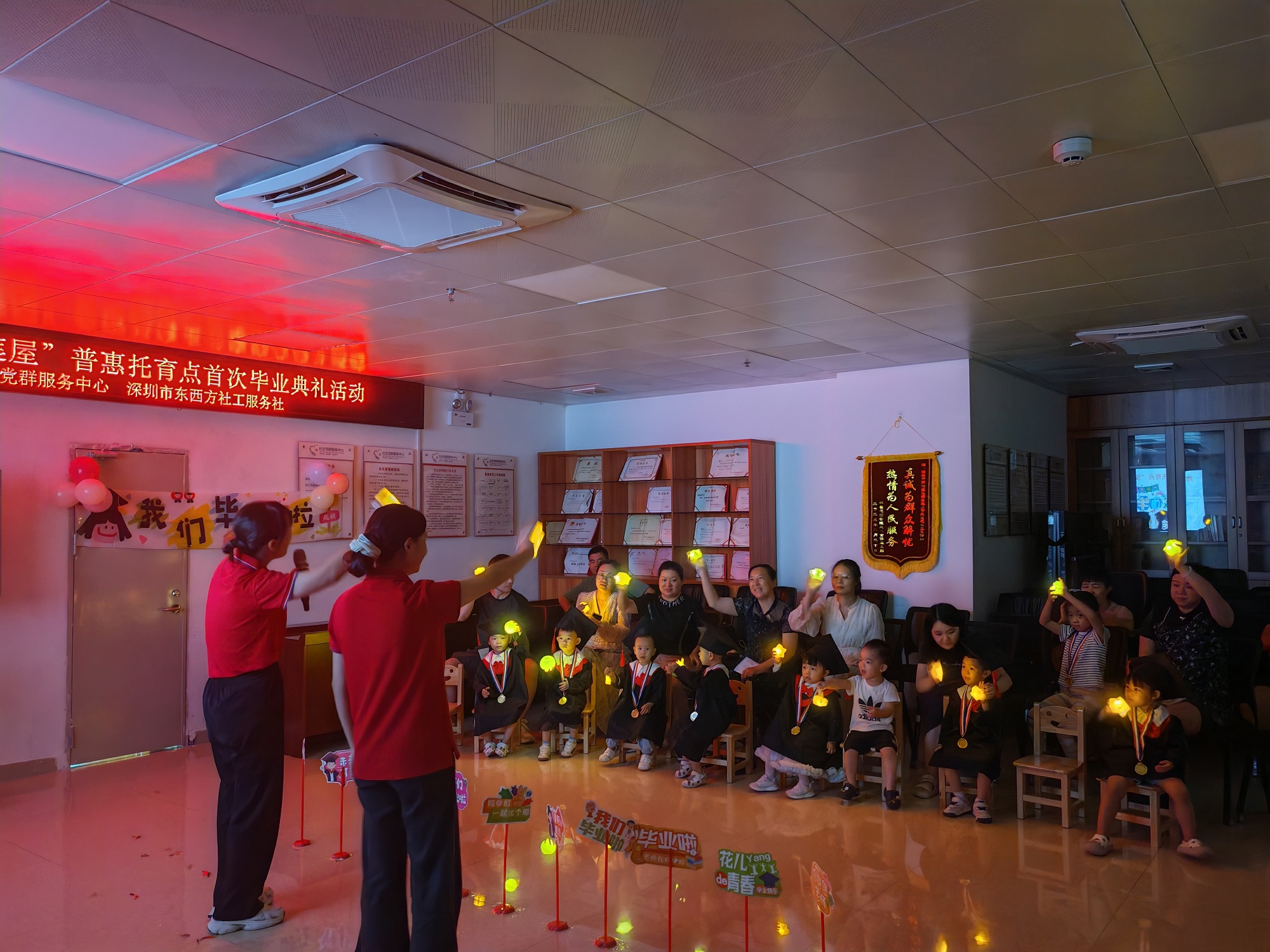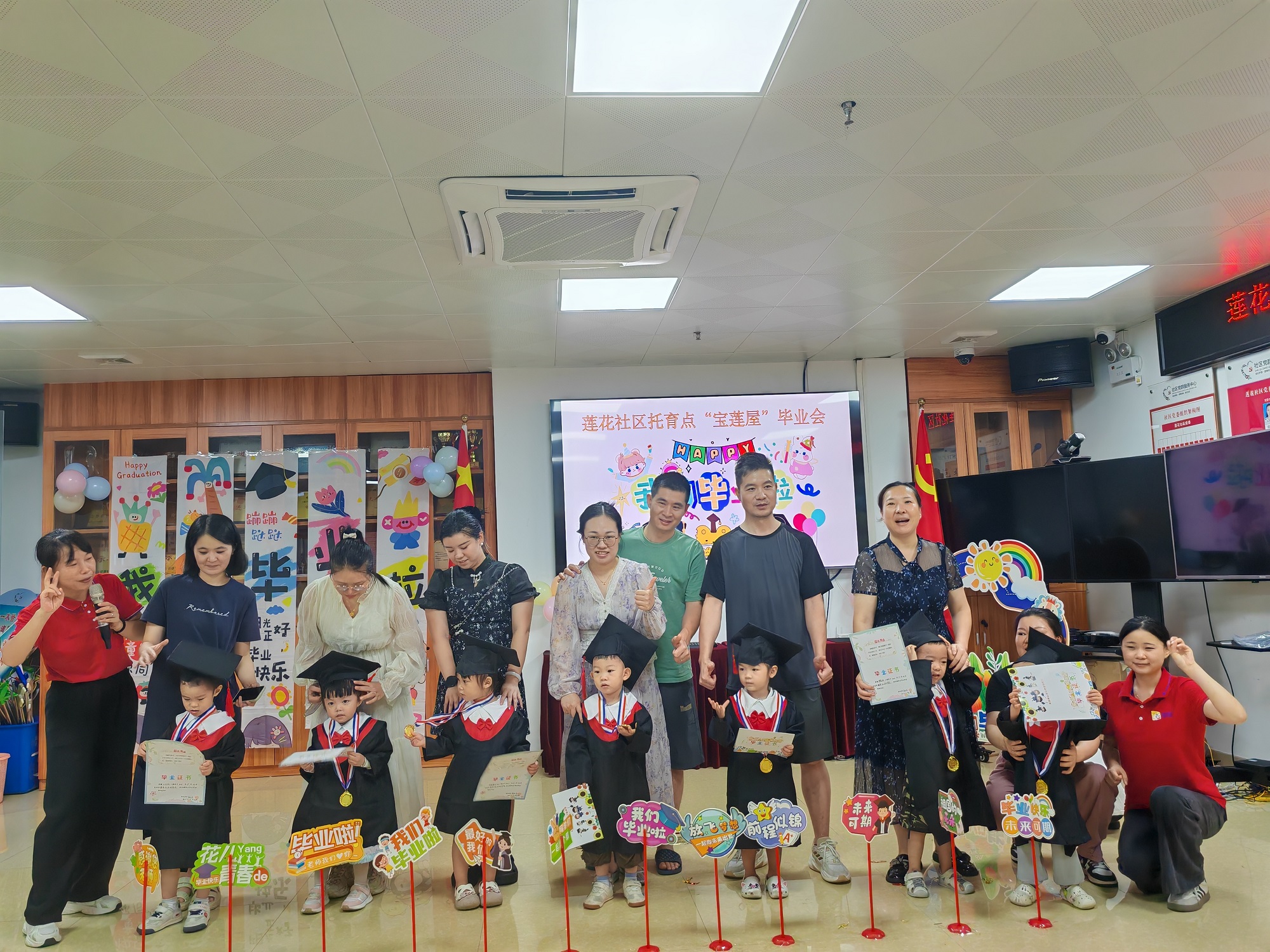 典礼现场,家长们纷纷用手机定格着孩子们人生中的多个"第一次":第一次音乐演奏《棒棒糖铃鼓表演》、第一次国学音乐表演《古诗串烧》、第一次在亲子舞蹈中与父母默契转圈......穿上毕业服、颁发奖章、奖杯,典礼在全场齐唱《再见》中落下帷幕。据悉莲花社区“宝莲屋”普惠托育点自去年年底开启以来,深受社区家长们的青睐,受益家庭236户,900多人次。“这里不仅是托管的场所,更是科学育儿的实践基地,关键是还优惠,现在政府政策越来越好了!”祖辈张奶奶感慨道,她通过参加托育点的活动与孙子沟通顺畅了许多。“从托育点开办以来一直在这里上课,平时我独自带娃,有时候有个急事要出门带着娃又不方便,现在好了家旁边就有托育点解了燃眉之急!”港籍的谢女士感激地说。